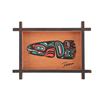 The multi-coloured salmon is painted on wood backing, the frame has a shadow-box design with black painted side rails