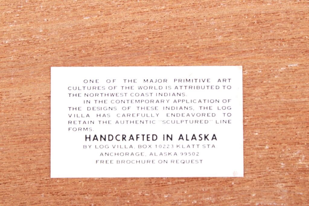 On the rear is printed, "One of the major primitive art cultures of the world is attributed to the northwest coast Indians. In the contemporary application of the designs of these Indians, the Log Villa has has carefully endeavored to retain the authentic, "sculptured" line forms.