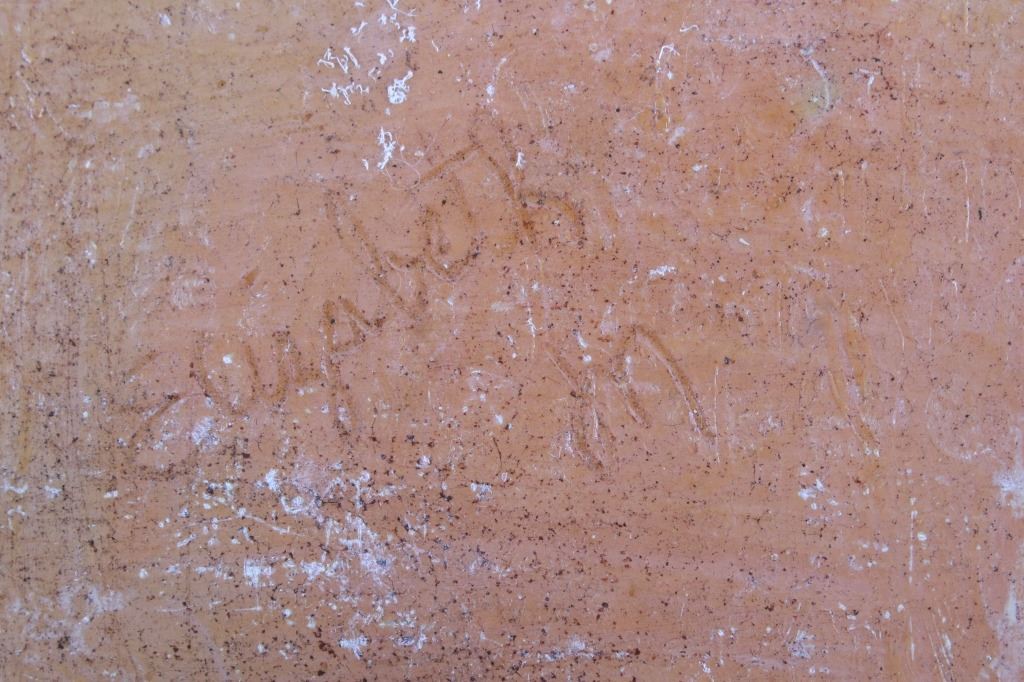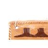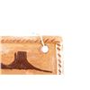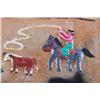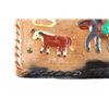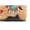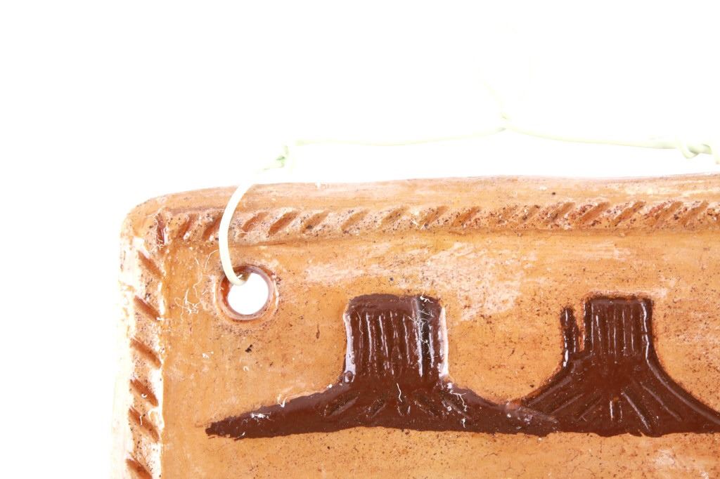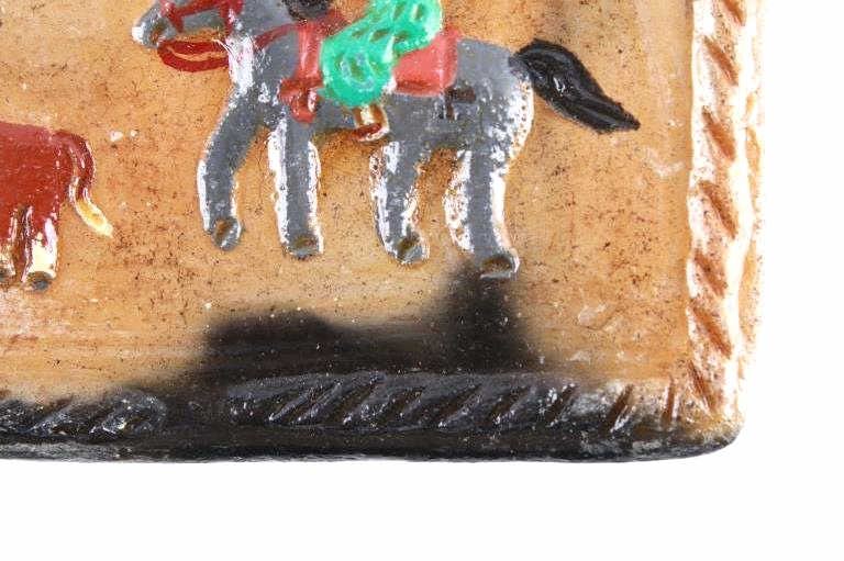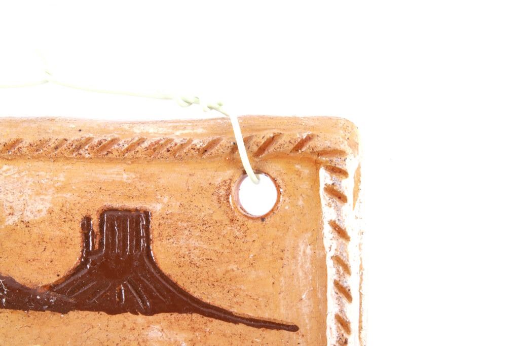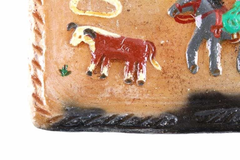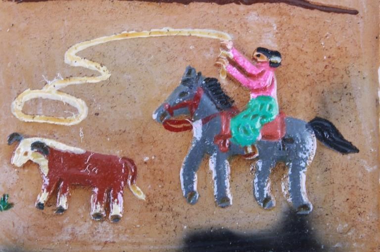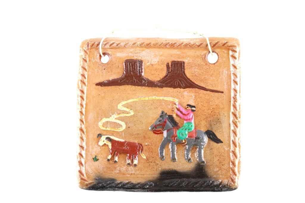 4) a ceramic wall hanging depicting a horseback rider lassoing a cow with a background of two mesas, vivid colours, autographed on the rear, Elizabeth M, 4.5"H x 4.75"W