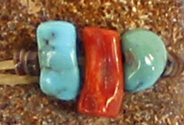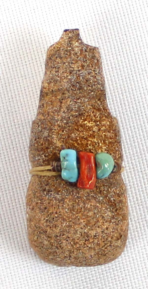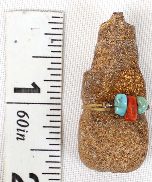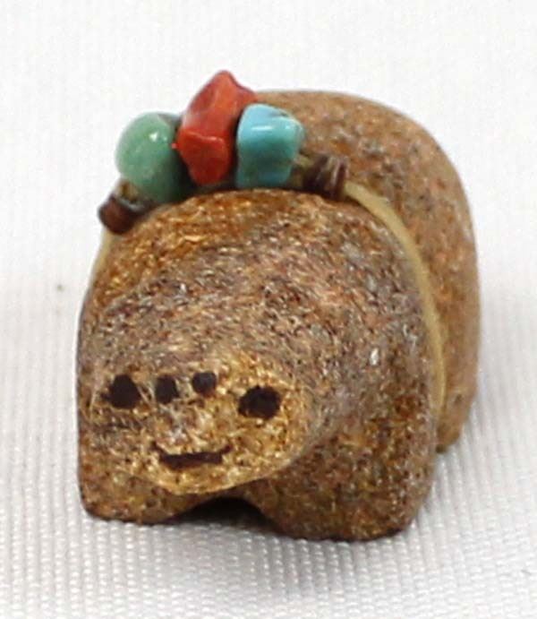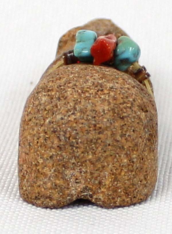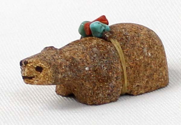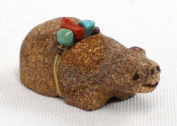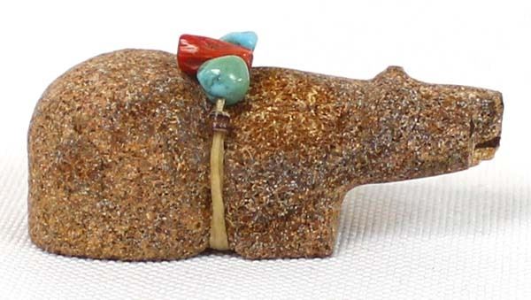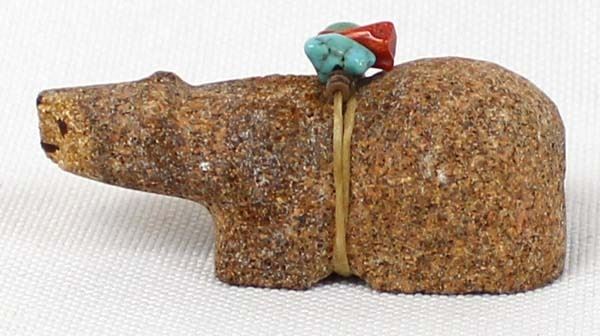 Native American Zuni Sandstone Bear Fetish by Felino Eriacho, measures 1.5'' x .5'' x .5'' and has artist's initials on the bottom, turquoise nuggets and coral spirit bundle