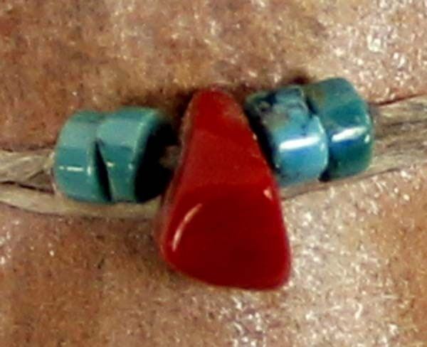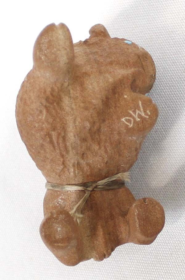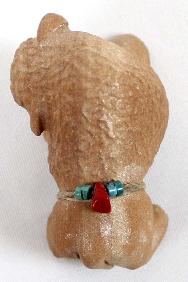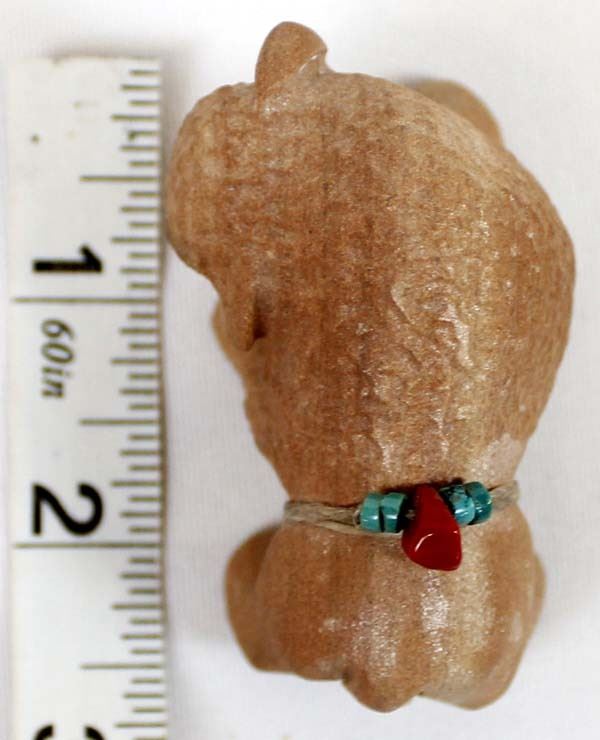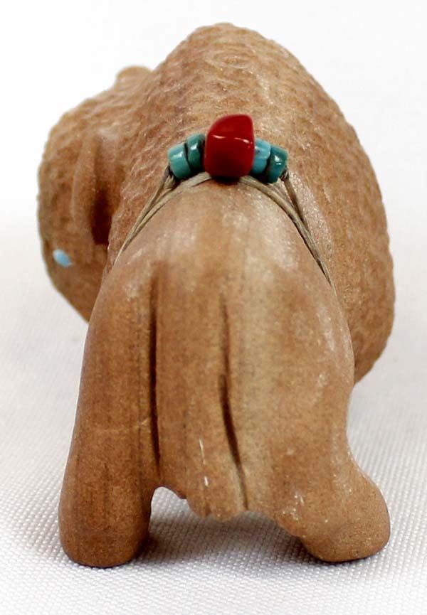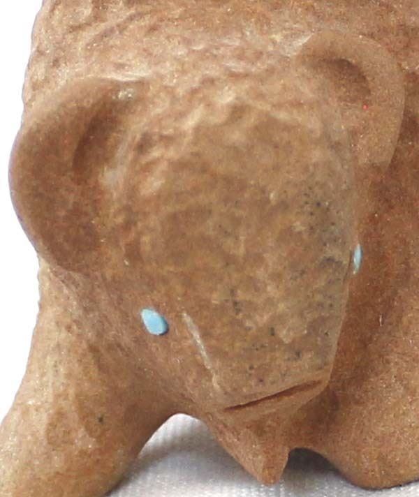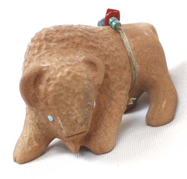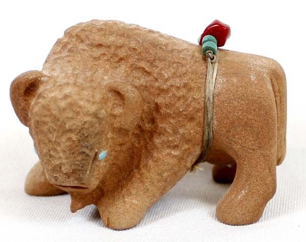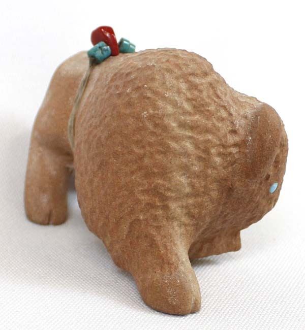 Native American Zuni Sandstone Buffalo Fetish by Darrell Westika, measures 2'' x 2.5'' and has artist's initials on the bottom, coral and turquoise heishi bead spirit bundle, turquoise eyes