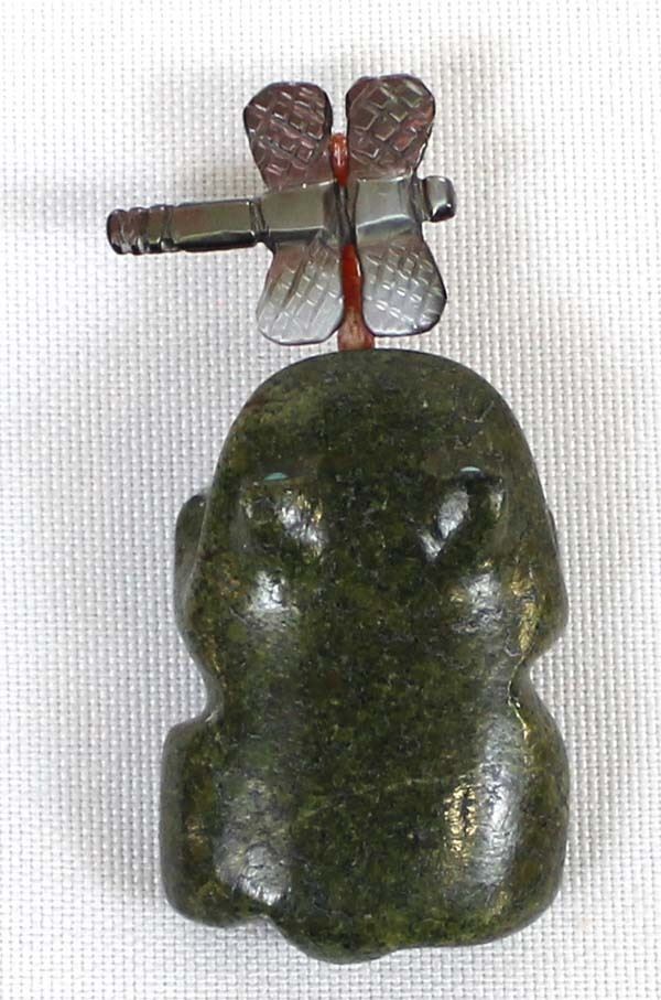 Native American Zuni Serpentine Frog & Dragonfly Fetish by Daisy Natewa, measures 1'' x 2'', turquoise eyes and coral tongue