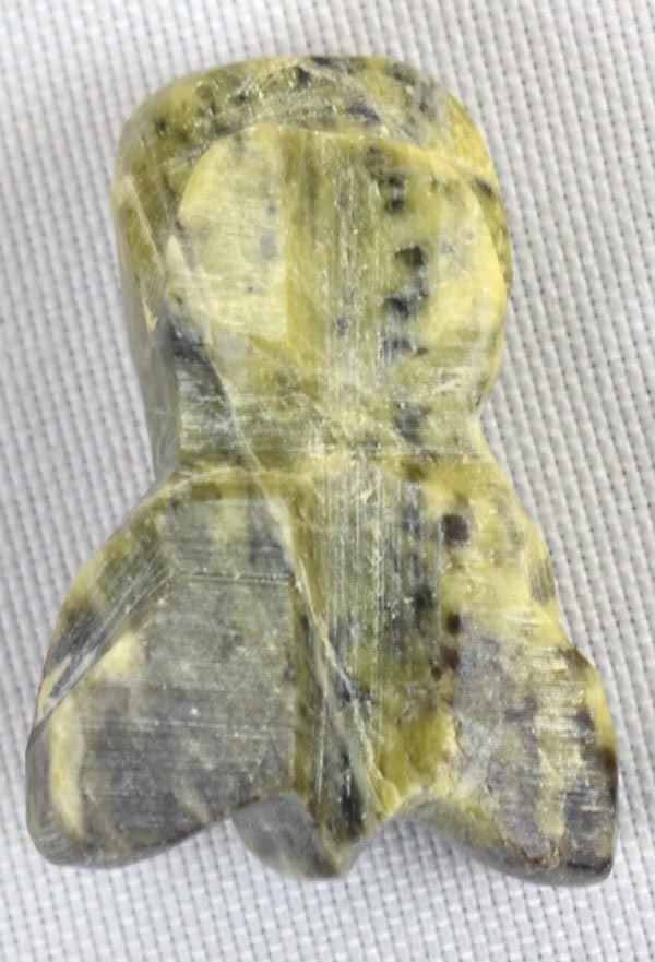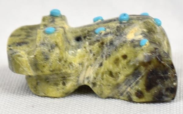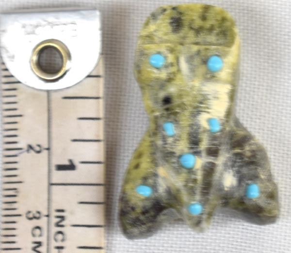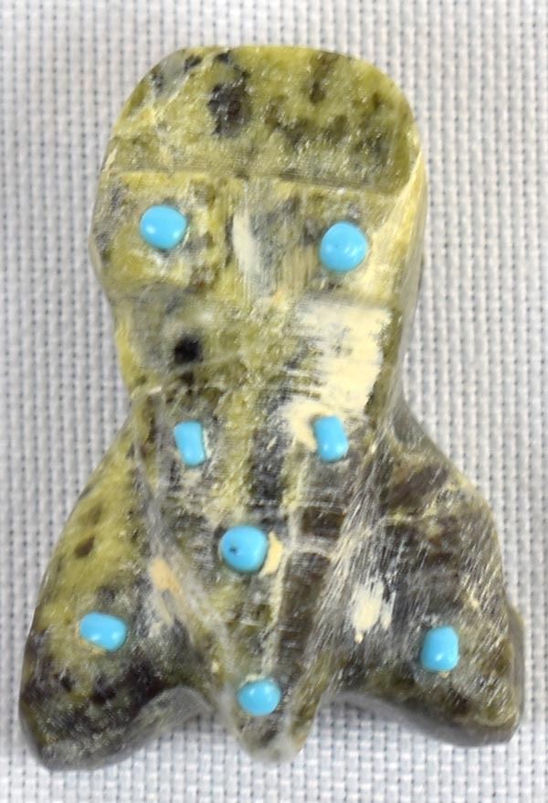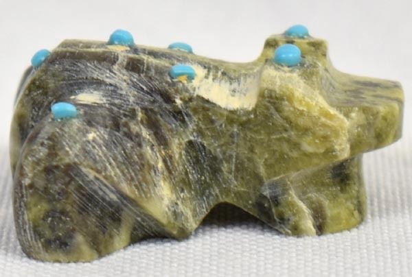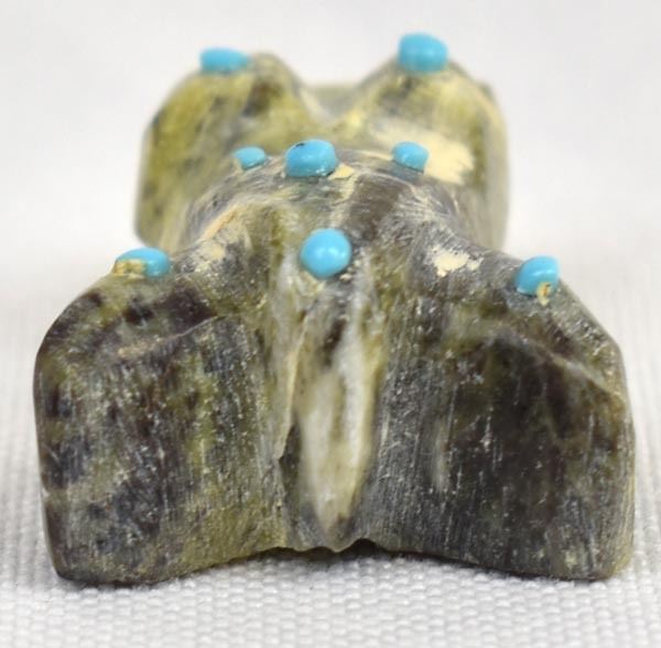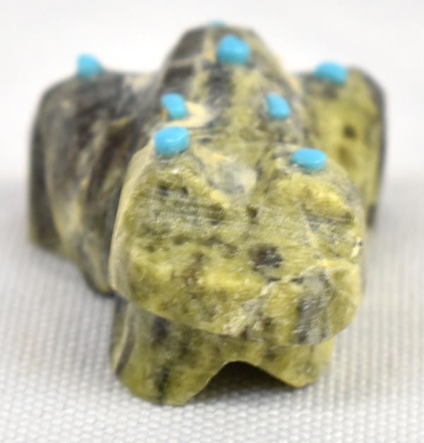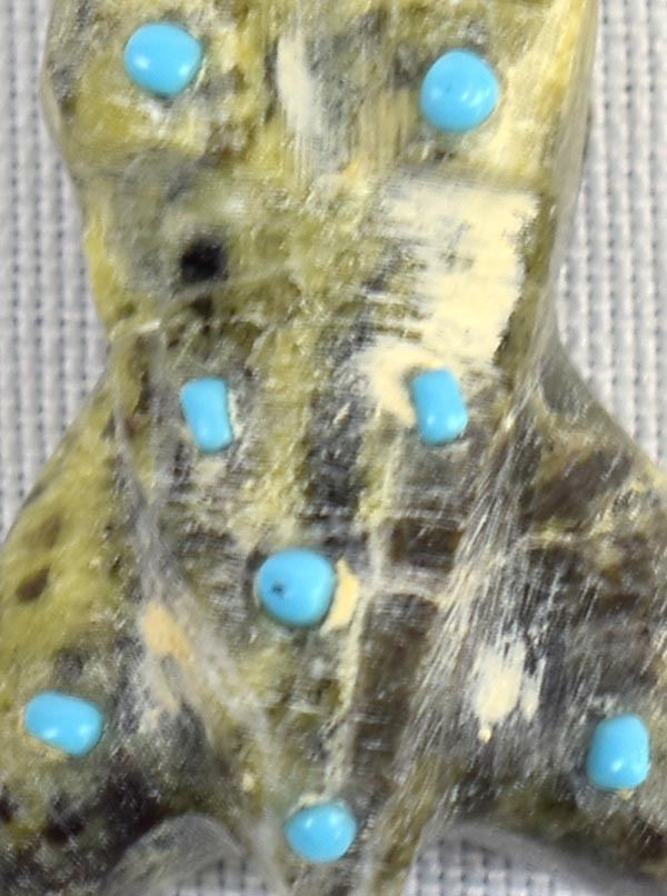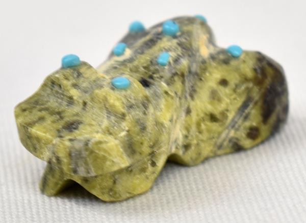 Native American Zuni Serpentine Frog Fetish by Pinto, measures 1.25'' x .75'', turquoise microdot spots and eyes
