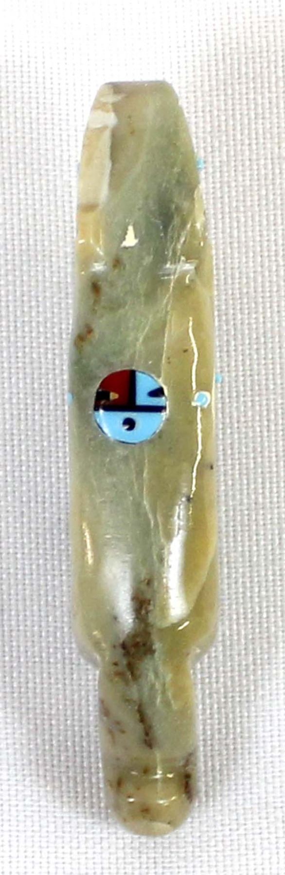 Native American Zuni Serpentine Mountain Lion Fetish by Danette Laate, measures 2.5'' x .5'' and has artist's initials DL, inlay sun face on the back and turquoise eyes