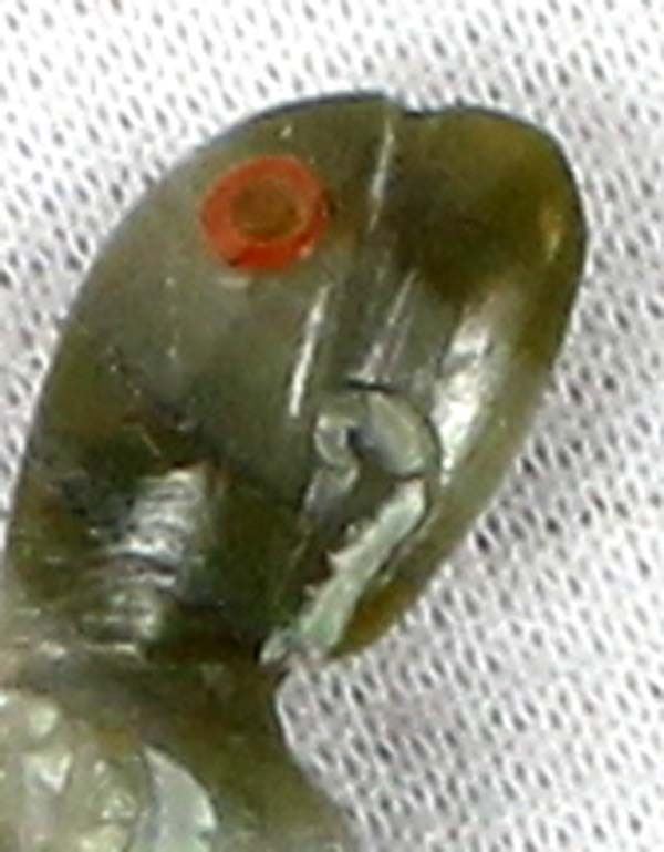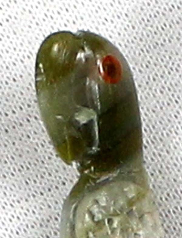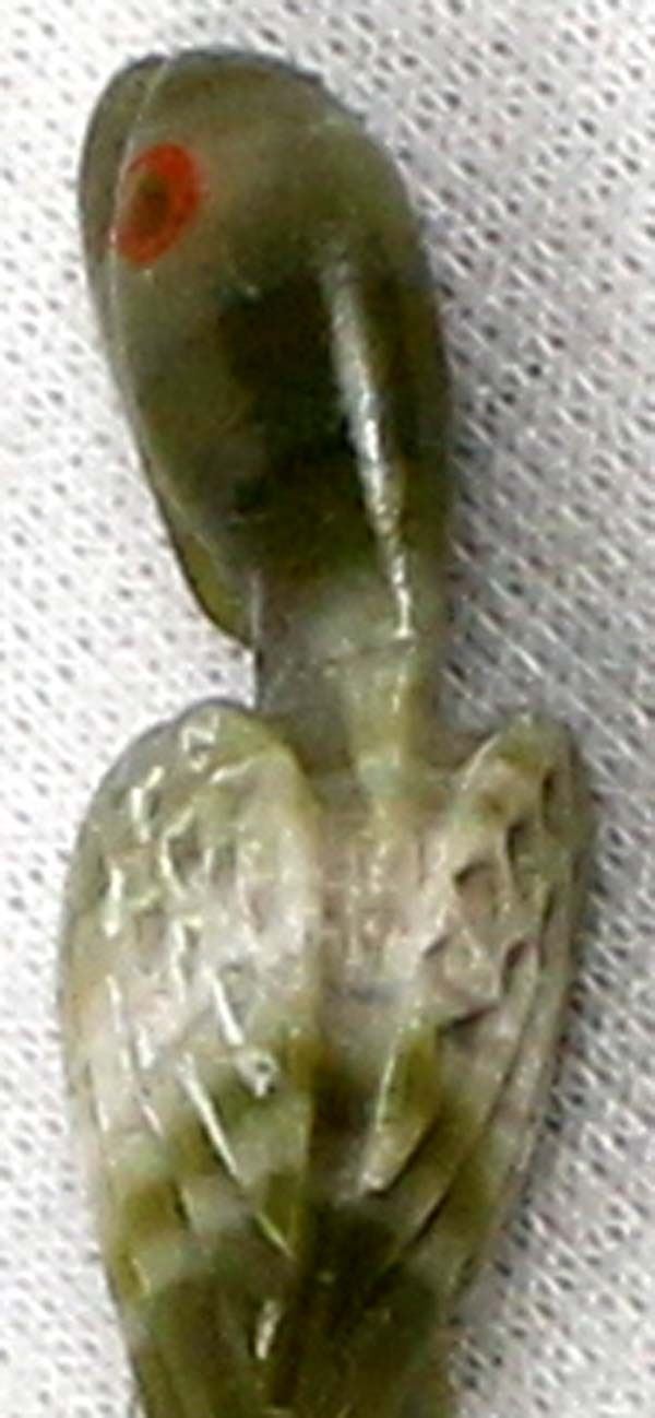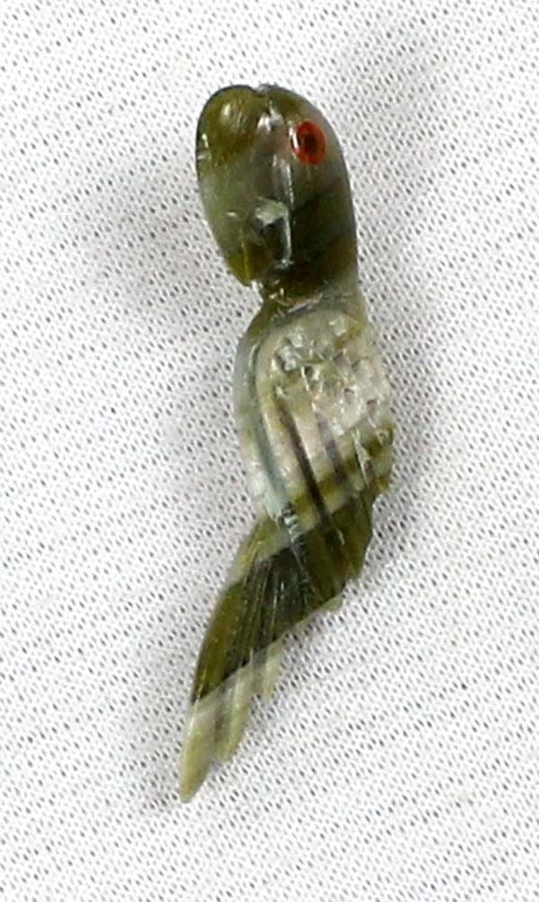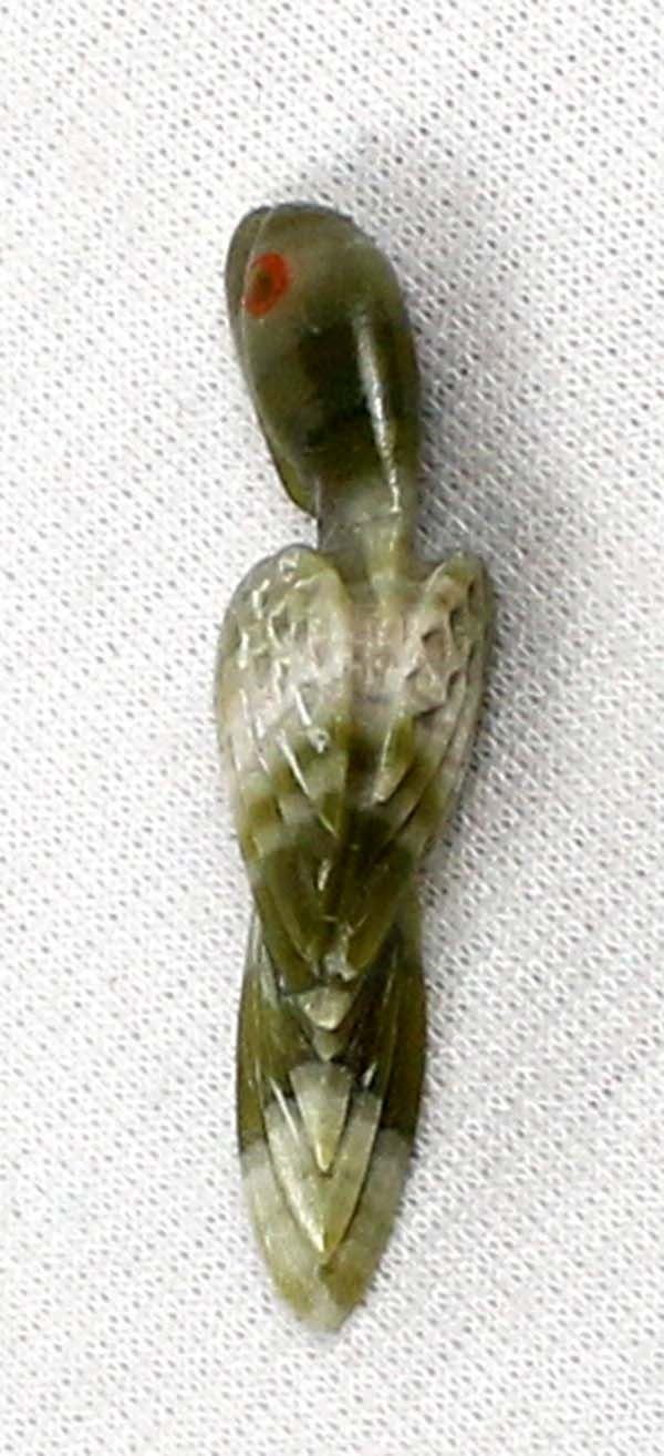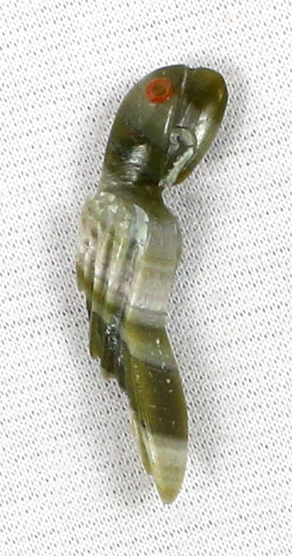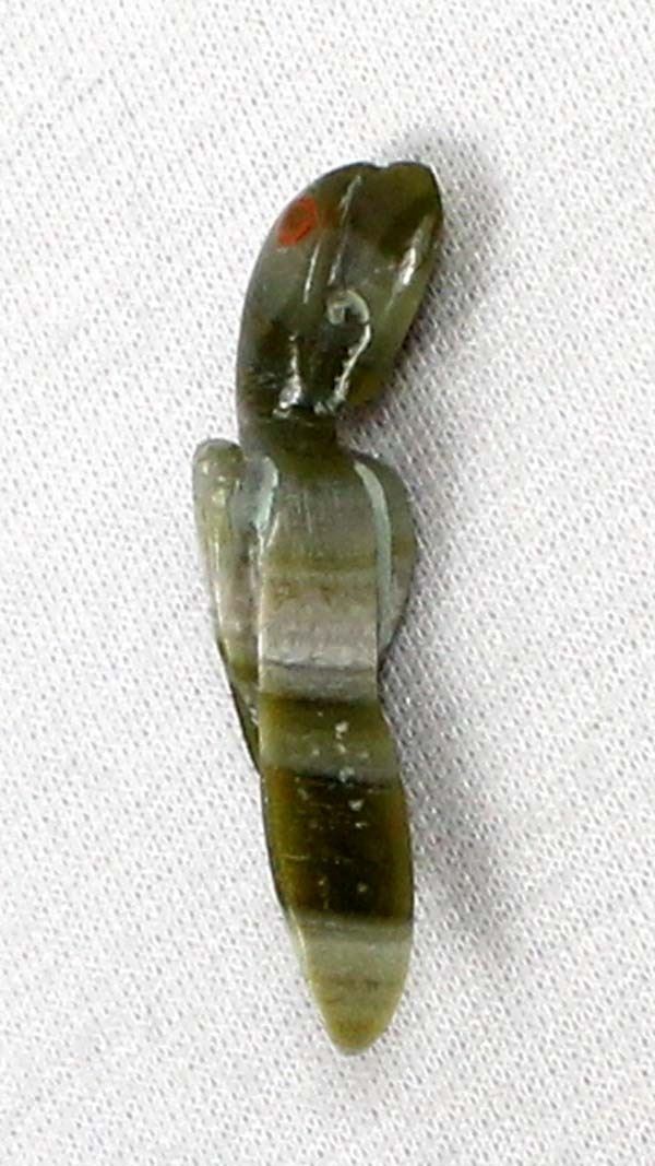 Native American Zuni Serpentine Parrot Fetish by Dan Simplicio Jr., measures 1 3/8''L x 3/8'' and is signed on the bottom, coral eyes