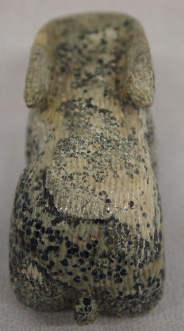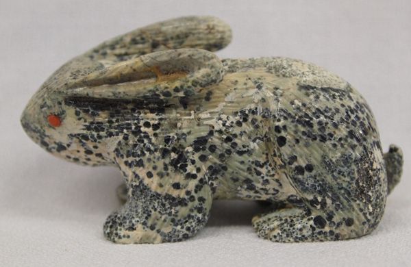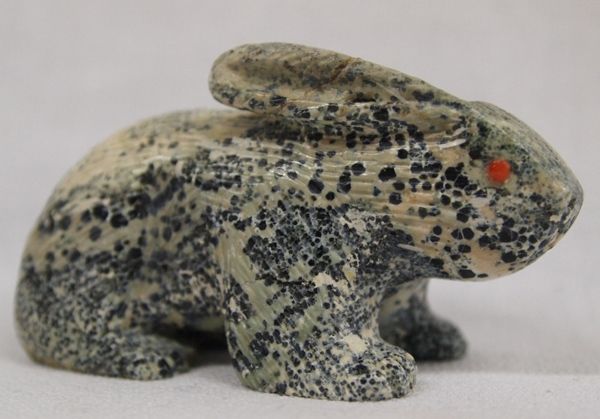 Zuni Serpentine Rabbit Fetish by Barry Yamutewa, measures 1.5'' x 3'', beautifully carved with red coral eyes, hallmarked BY on bottom of rabbit's paw, carved fur details, He's a cutie!