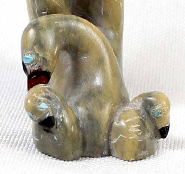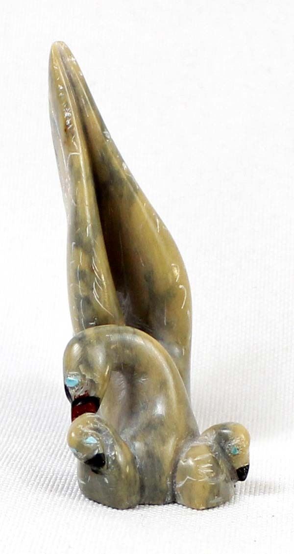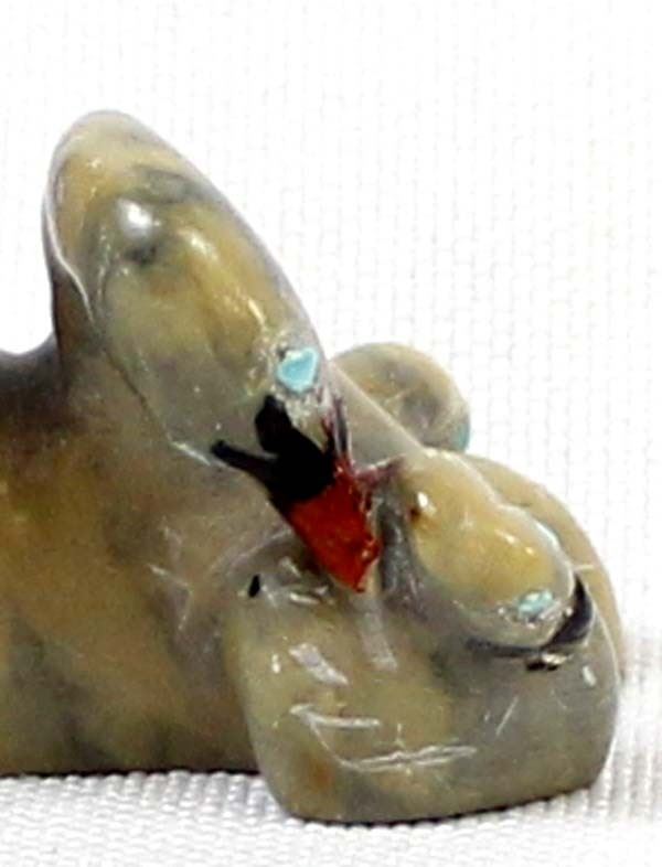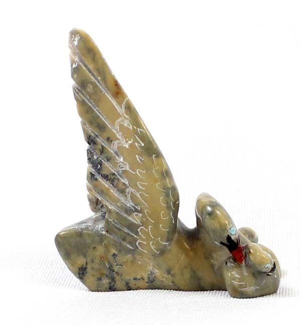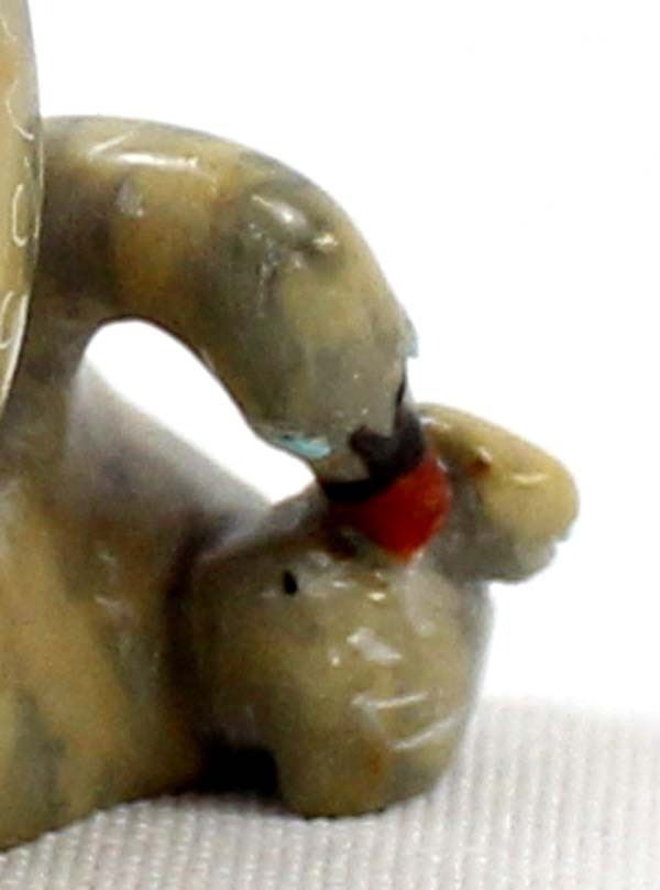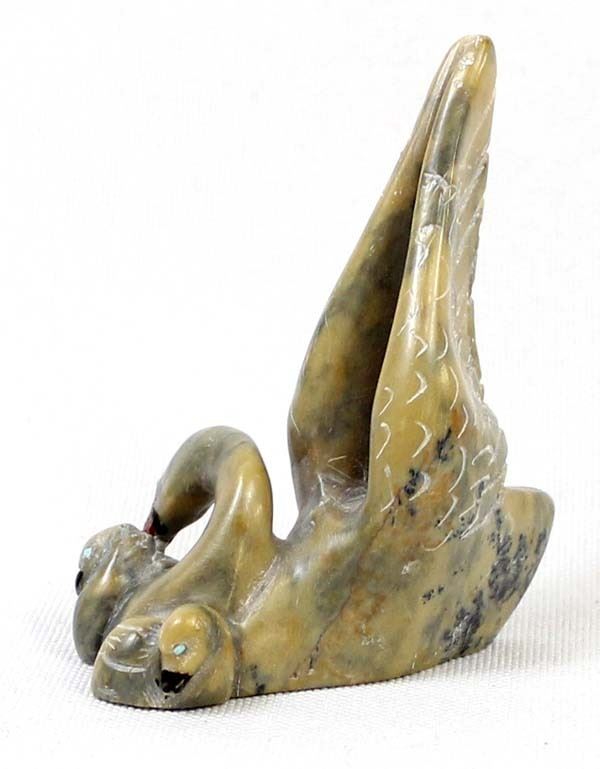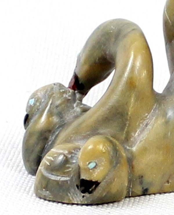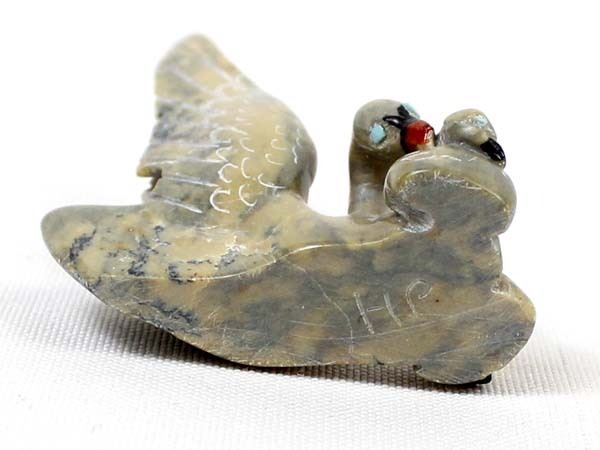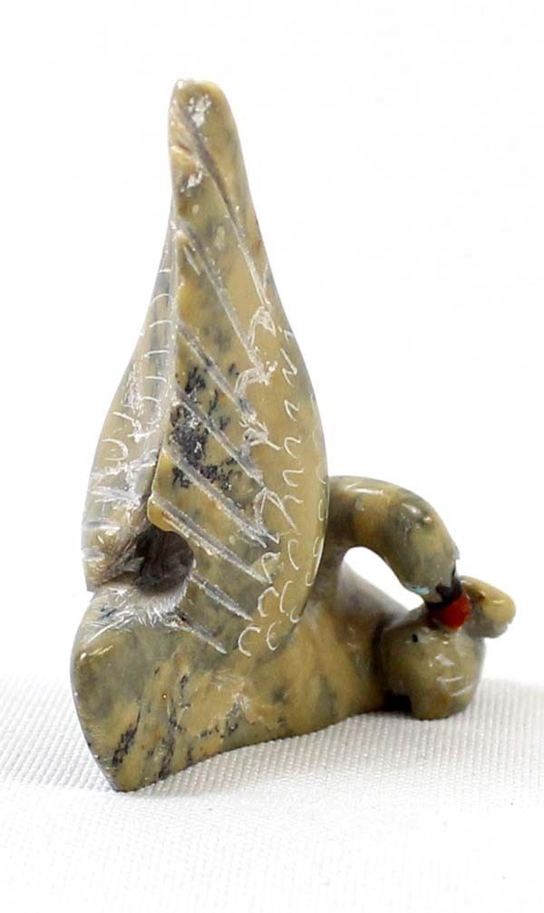 Native American Zuni Serpentine Swan Fetish with Cygnets by Herbert Pincion, measures 2.5'' x 2.5'' x 1'' and has artist's initials on the bottom HP, turquoise eyes, coral and jet beaks