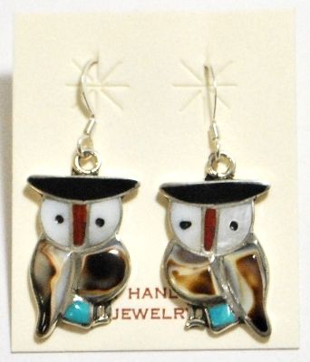 Zuni Shell & Turquoise Owl Sterling Silver French Hook Earrings - Pitkin Natewa