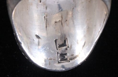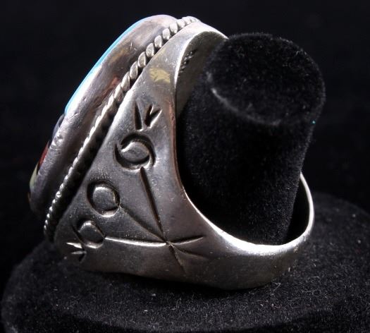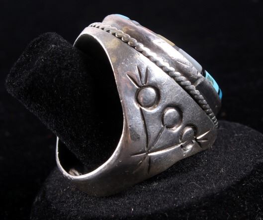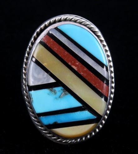 Included in this lot is a signed Zuni Native American, Mary Livingston, inlaid multi-stone and sterling silver men's ring. This inlaid ring features a wonderful multi-stone inlaid design consisting of mother of pearl, abalone, sleeping beauty turquoise, branch coral, and onyx. The stone is set into a shadow box and braided design. There are engravings on each side of the band. The back of the ring is signed by the artist, "M.L." for Mary Livingston. This ring is in good condition, measuring size US 11 1/4.