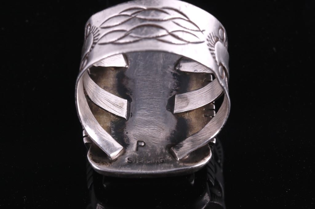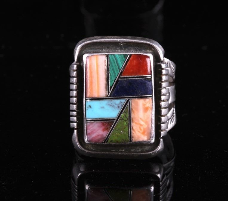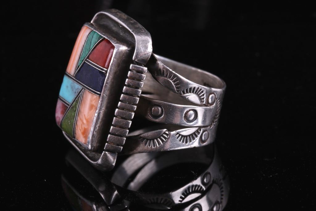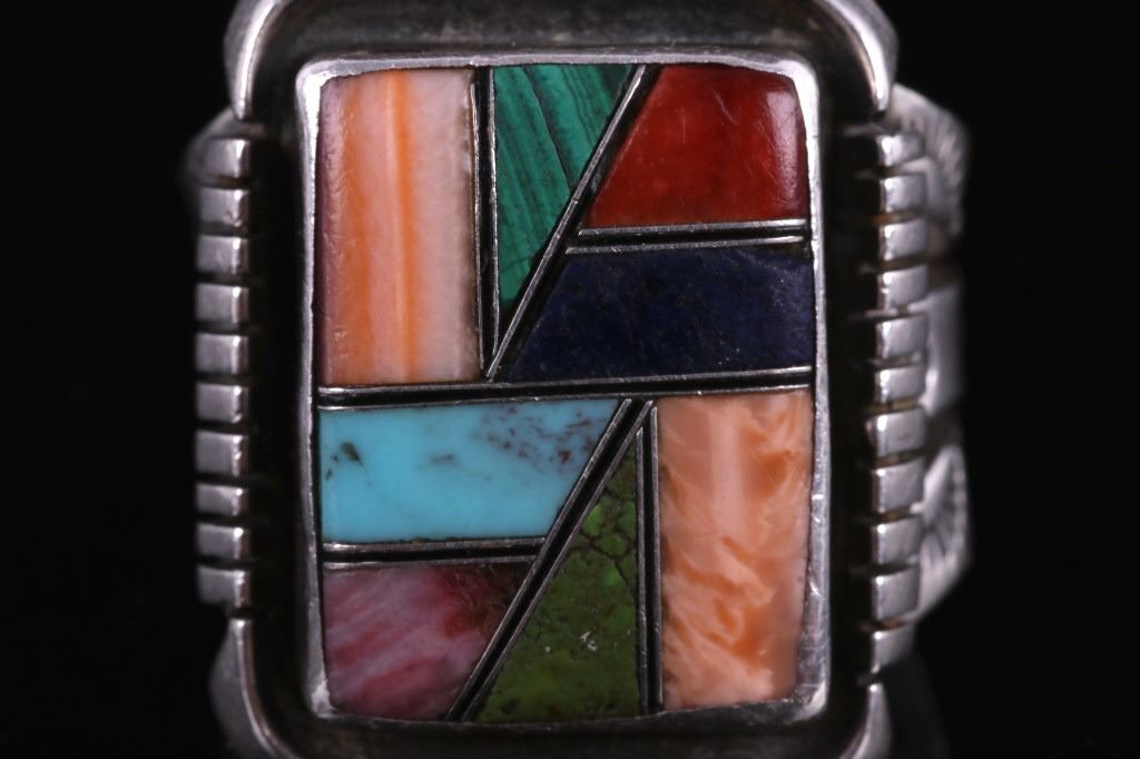 For your bidding pleasure is a singed sterling silver mosaic inlay ring from a Zuni Native American Indian master silversmith. This stained glass style ring features turquoise, branch coral, malachite. sugalite, and spiny oyster shell inlay. Each gem is separated by detailed line of silver and onyx. Incredibly detailed shadow box that segways into an intricate ring band with fine engravings. Signed "P" and stamped sterling this ring measures 10 1//2 US.