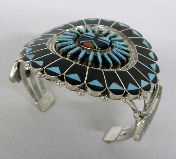 Zuni Silver, Jet, Turquoise and Coral Channel Inlay Bracelet by Benji Tzuni. Measures approx. 6.5'' inside and 2.5''W. SHI $15.