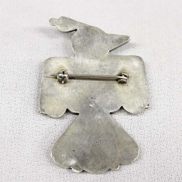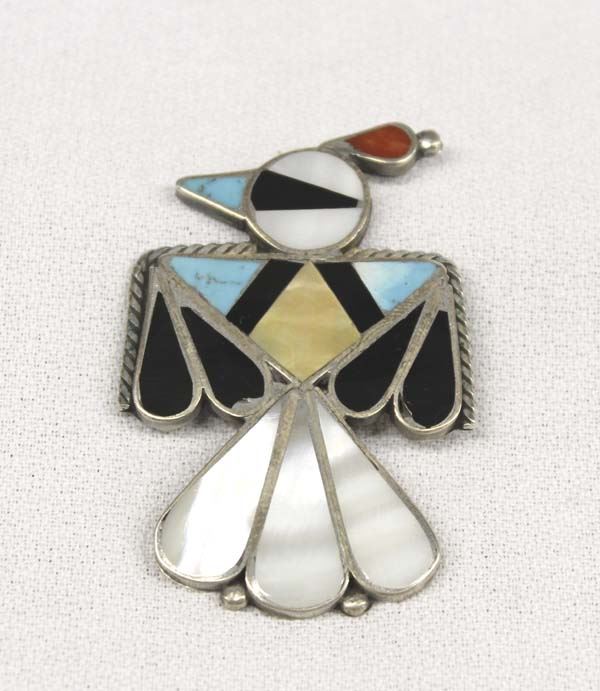 Native American Zuni Sterling Silver Channel Inlay Thunderbird Pin, inlay includes turquoise, jet, mother of pearl, and gold lip shell, measures 2''L x 1.5''W, 14g in total wt.
