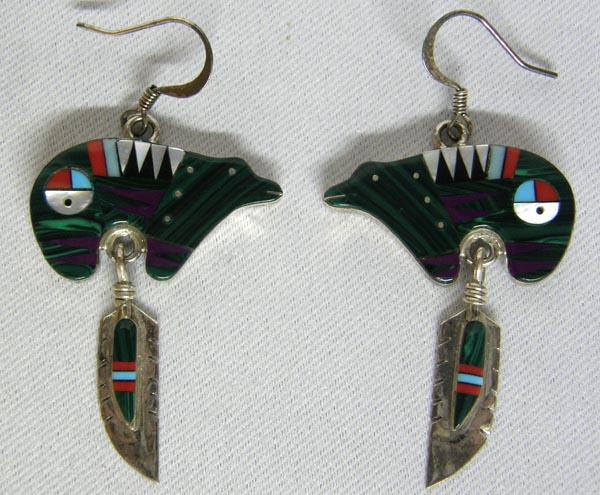 Zuni Sterling Silver Inlay Bear Earrings, measures approx. 2'' long. SHI $15.