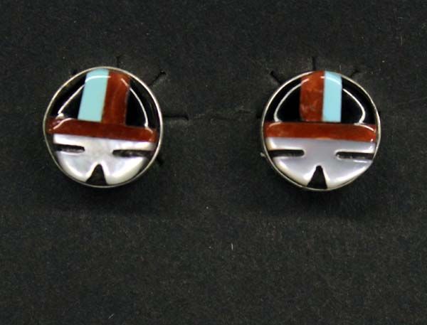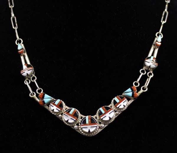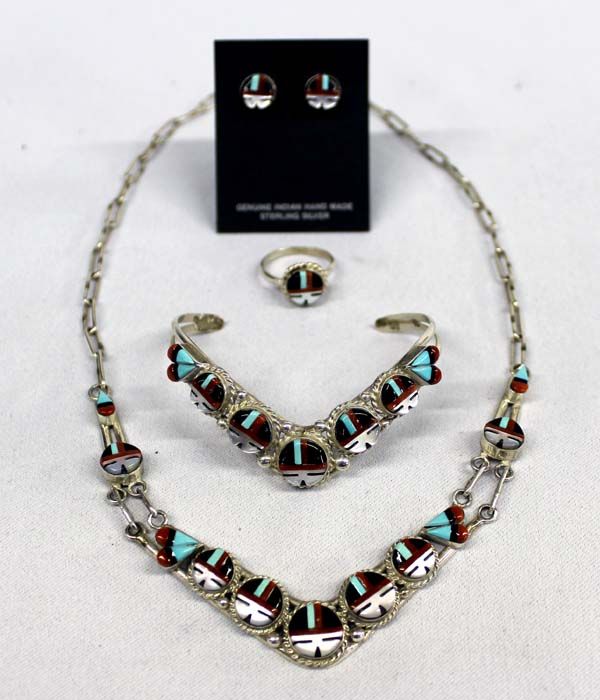 Zuni Sterling Silver Stone to Stone Inlay Sunface Necklace, Earrings, Ring, and Bracelet Set, ring size 7.5, necklace measures 18'' end to end and v-shaped pendant measures 3''W x 1.25''L, inside measurement of bracelet is 6.5'' which includes opening x .5''W, earrings and ring sunfaces are 3/8''D, hand wrought chain, 45.4g in total wt.