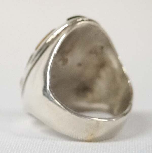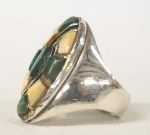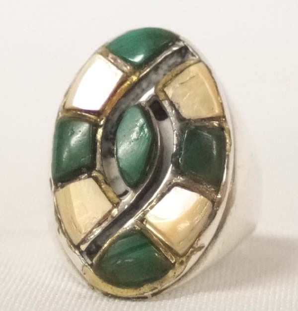 Native American Zuni Sterling Silver Malachite and Gold Lip Shell Double Hummingbird Ring Size 10.5, measures 1.25''L, 22.71g in total wt.