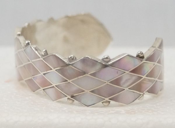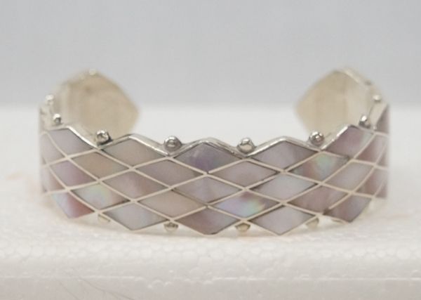 Zuni Silver Mother of Pearl Bracelet by Steve Wallace, inside measures 6'' which includes opening x 11/16''W, features gorgeous pink mother of pearl channel inlay with silver bead accents, engraved signature inside, very elegant bracelet, 22.3g in total wt.