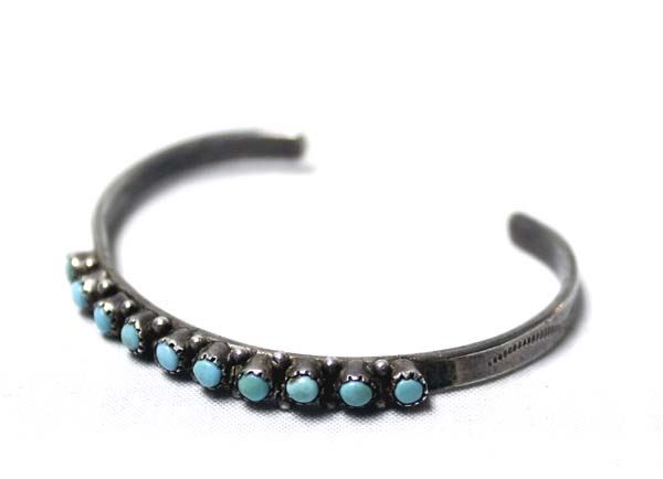 From the Nupp Estate in Silver City NM, we have a Sweet Native American Zuni Sterling Silver Petit Point Bisbee Blue Turquoise Child's Bracelet, inside measures 4.25'' which includes opening x .25''W, 5.15g in total wt.