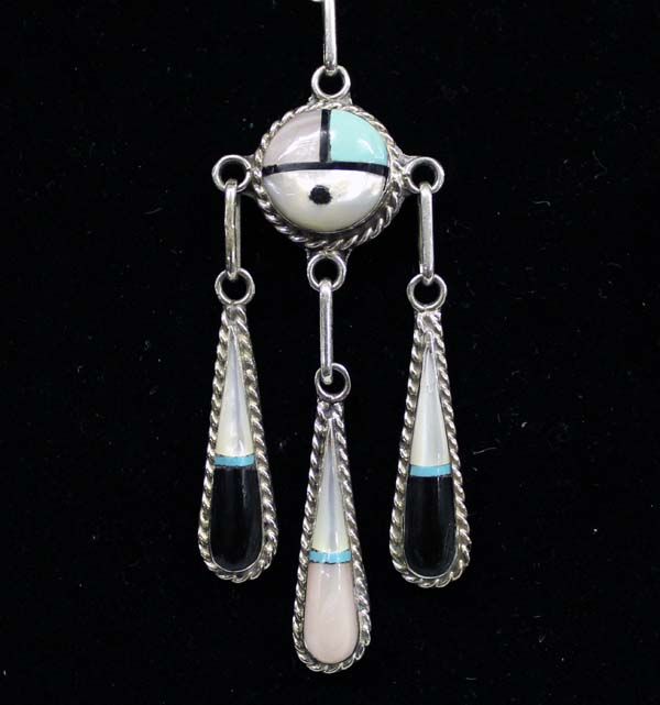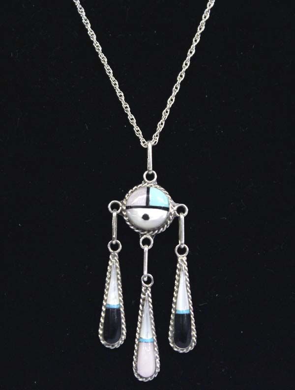 Zuni Silver Stone to Stone Inlay Pendant Necklace, chain measures 22'' end to end, pendant measures 2 7/8''L x 1''W, beautiful sun face design inlay in mother of pearl, jet, and turquoise, chain is stamped sterling, 13.48g in total wt.