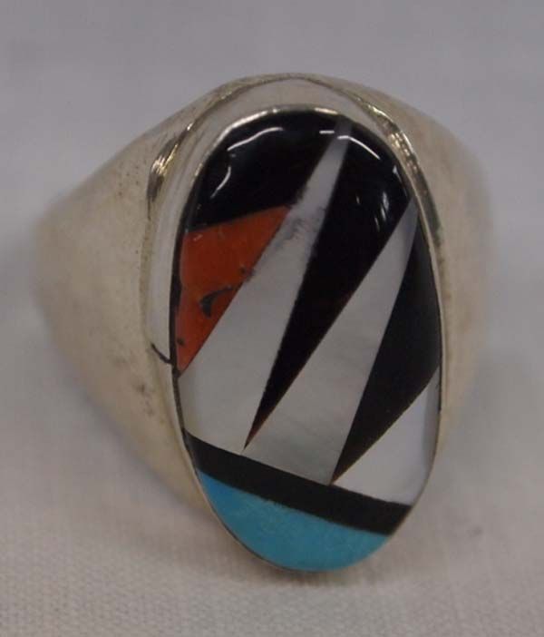 Zuni Silver Stone to Stone Inlay Ring, Size 10.75, measures 7/8''L x 7/8''W, inlay stones include mother of pearl, onyx, coral, and turquoise, 11.7g in total wt.