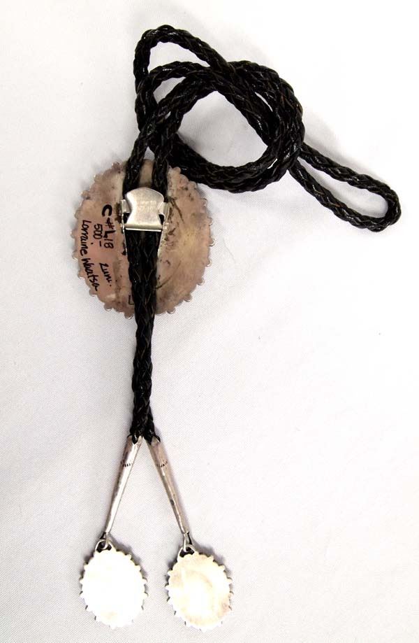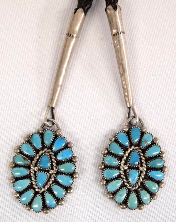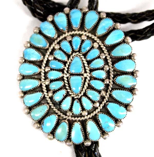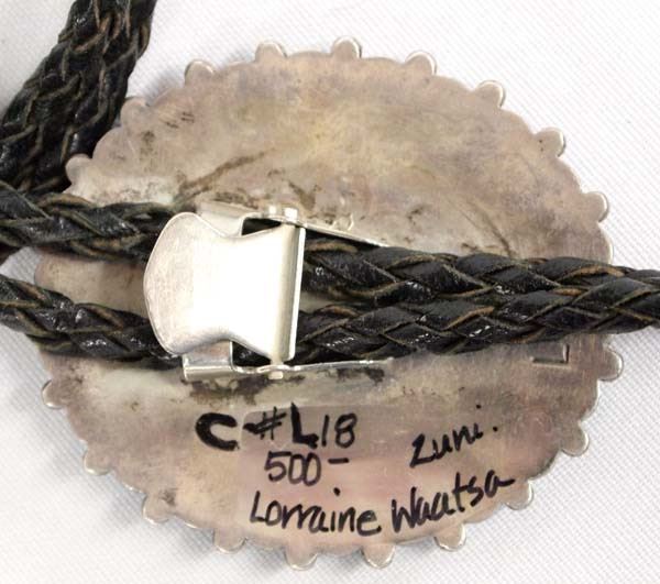 Exquisite Native American Zuni Sterling Silver Turquoise Bolo Tie by Lorraine Waatsa, slide measures 2'' x 2.5'', custom sterling turquoise tips, 65.8g in total wt. A true work of art!