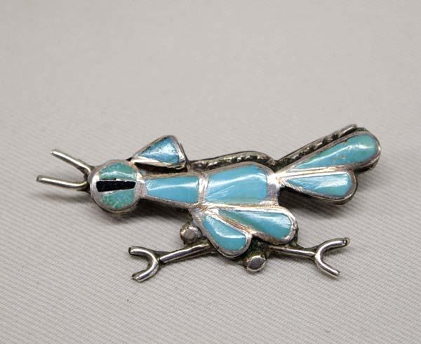 Zuni Silver Turquoise Channel Inlay Roadrunner Pin. Measures 1.75''x0.7''. SHI $15.