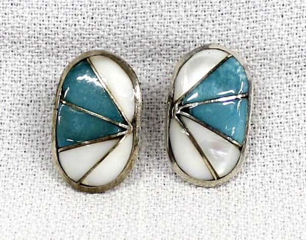 Native American Zuni Sterling Silver Inlay Turquoise and Mother of Pearl Earrings, measure .5'' x .75''