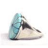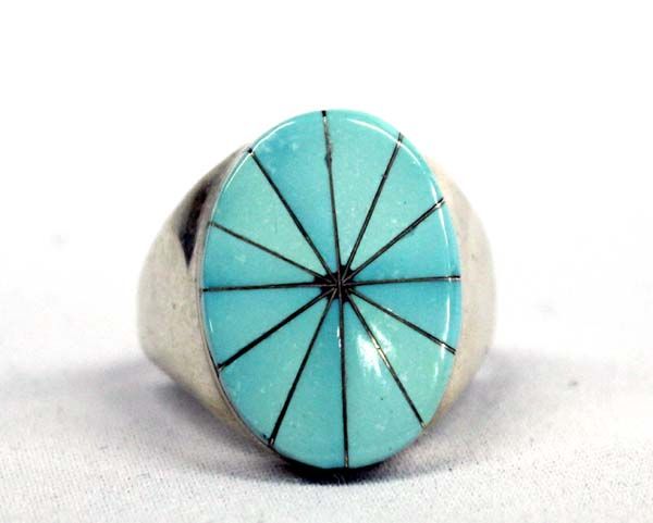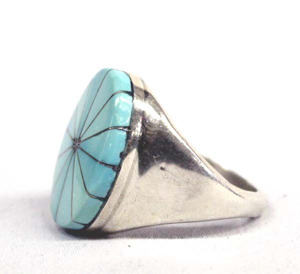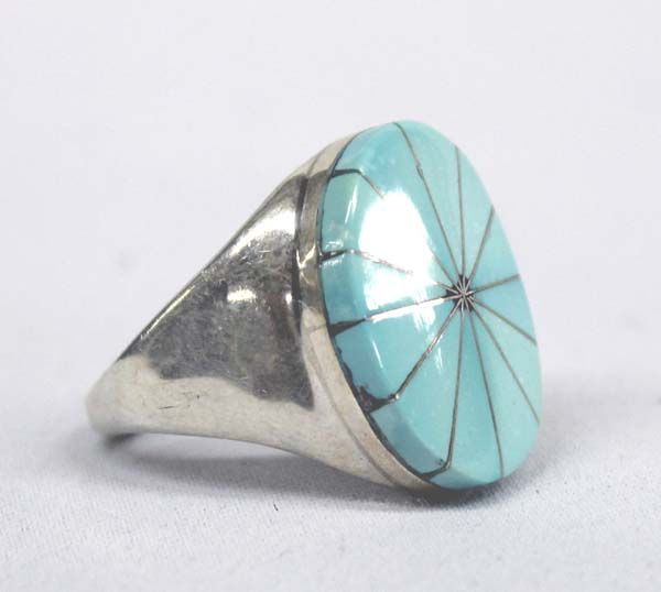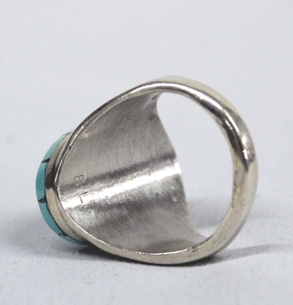 Remarkable Zuni Sterling Channel Inlay Turquoise Ring by Ben Livingston, size 12.25, measures 1'' x 1'', gorgeous pale blue turquoise, wide shank which tapers down, hallmarked BL, 19.58g in total wt.