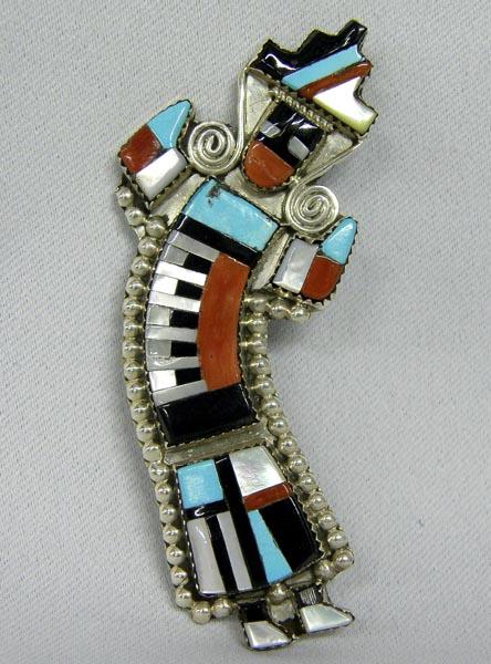 Zuni Silver and Stone to Stone (Turquoise, Coral, Jet and M.O.P.) Inlay Kachina Pin/Pendant. Measures approx. 3''Lx1.25''W. Buyers Pay Actual Shipping and Handling Charges(see terms and conditions for more information).