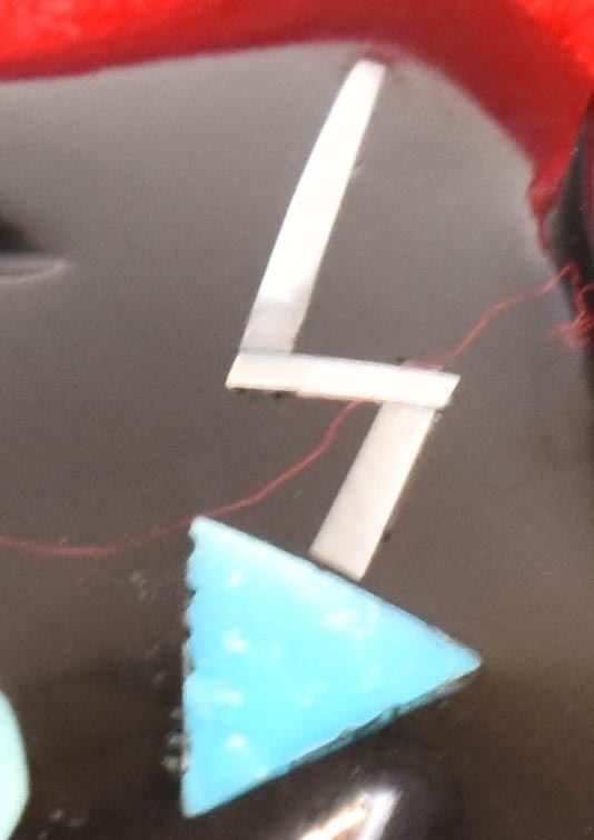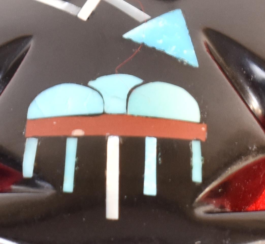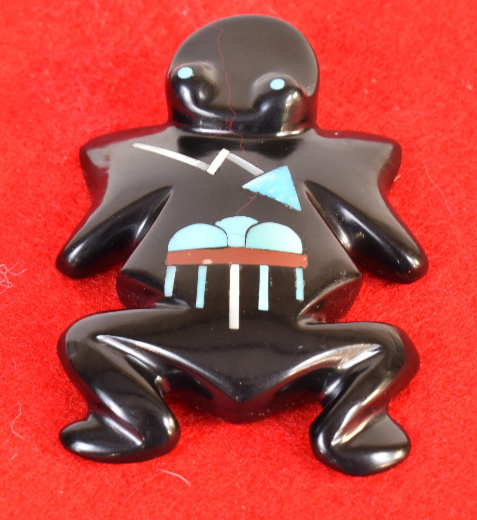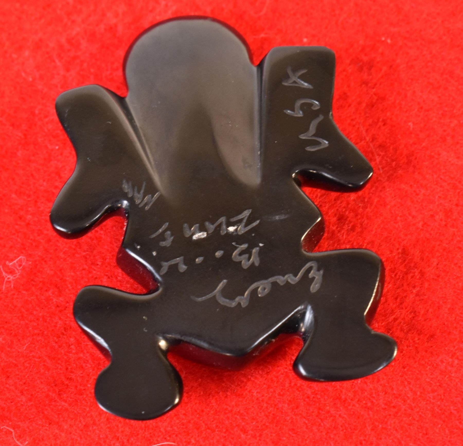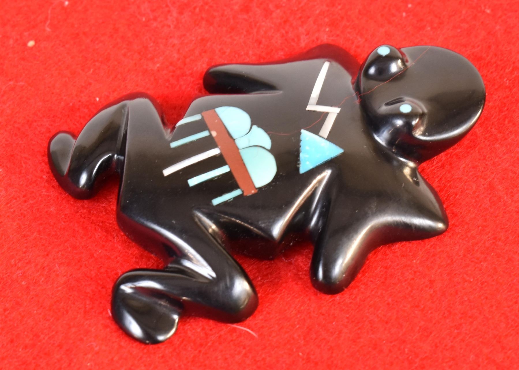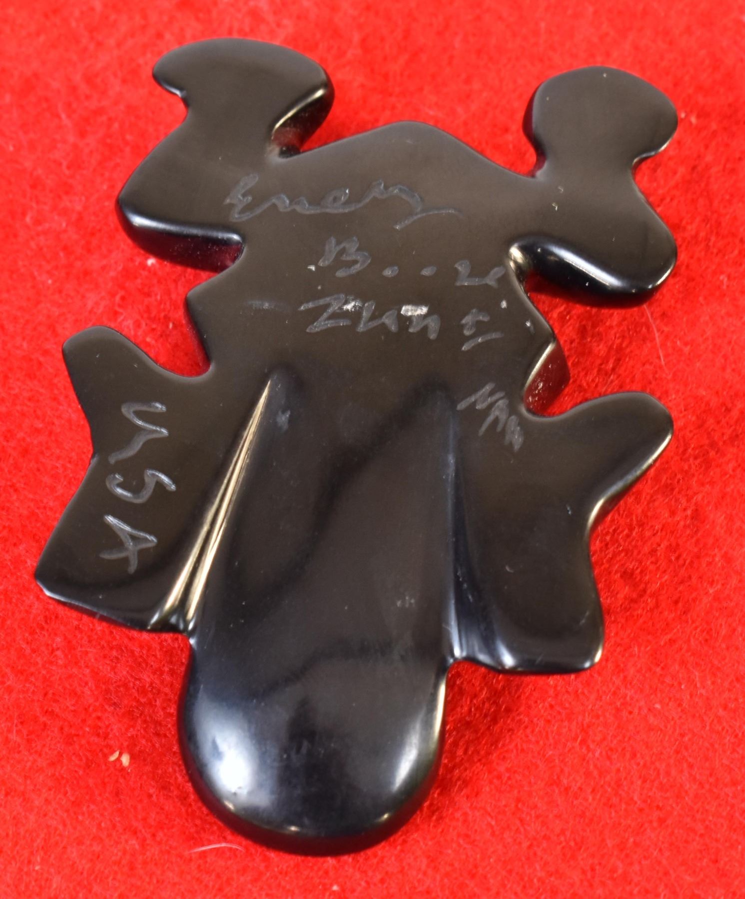 Native American Zuni Silverado Jet and Inlay Frog Fetish by Emery Boone, measures .5'' x 2'' x 3'' and is signed on the bottom, inlay lightning bolt and rain cloud on back, inlay includes turquoise, coral, and mother of pearl, beautiful fetish