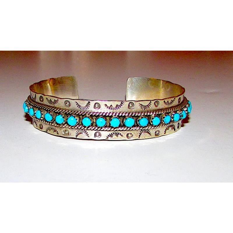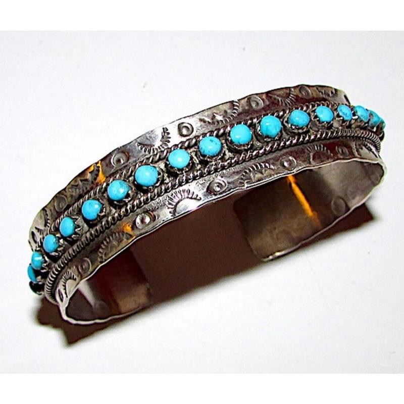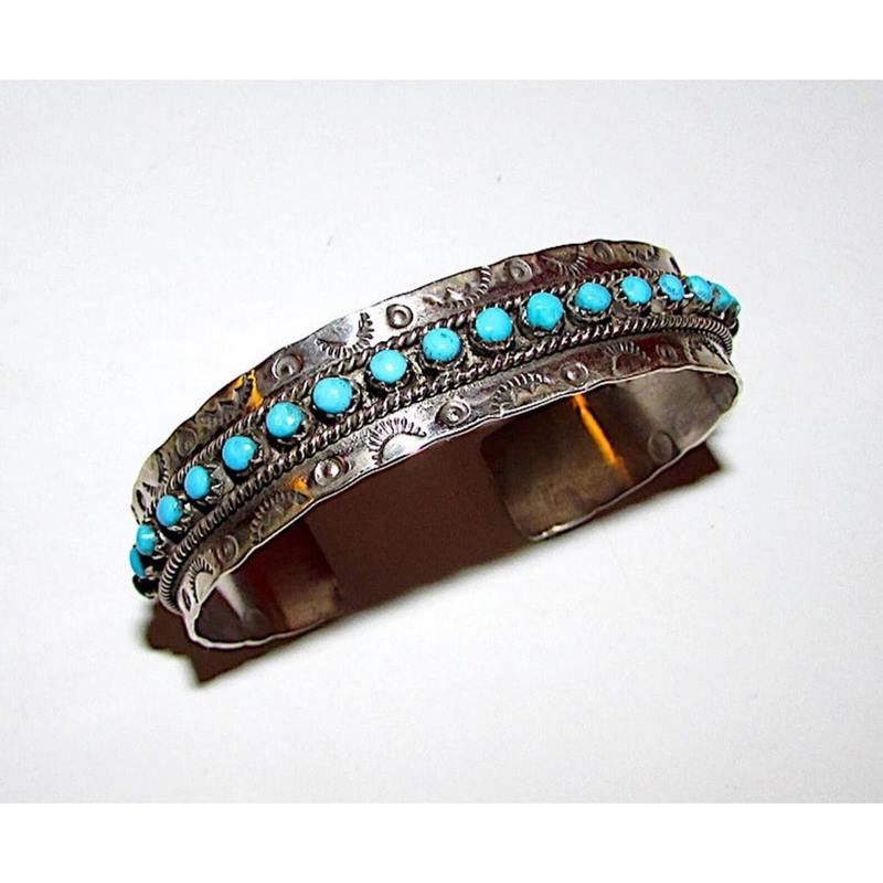 Stunning vintage Native American Zuni intricately hand etched sterling silver and "snake eye" Sleeping Beauty turquoise cuff bracelet. Wonderful craftsmanship and attention to detail, intricately hand etched design with ingot tribal symbols, accented with a row of round "snake eye" Sleeping Beauty turquoise on the front. The inside circumference is about 6 1/2" including the gap and the cuff can be carefully adjusted. Hallmarked, stamped sterling. Great as a stacker cuff. Wonderful example of wearable Native American art to add to any jewelry collection. FREE SHIPPING ON ALL JEWELRY ORDERS WITHIN THE US! WE SHIP ALL ITEMS IN-HOUSE!