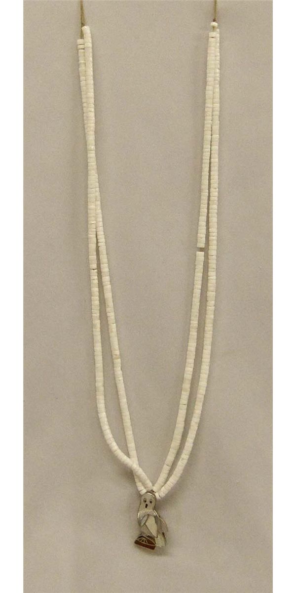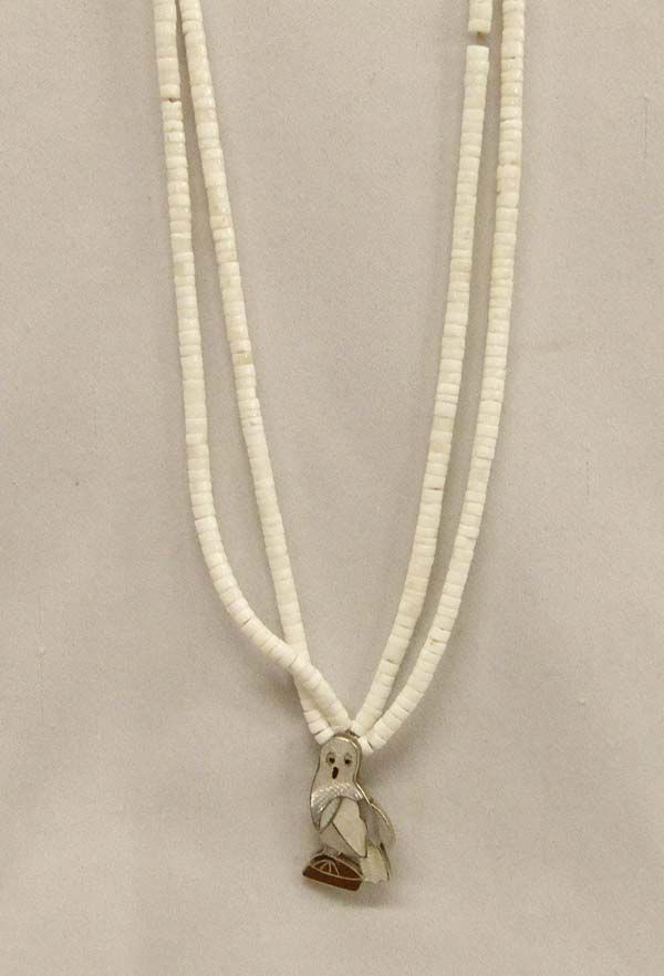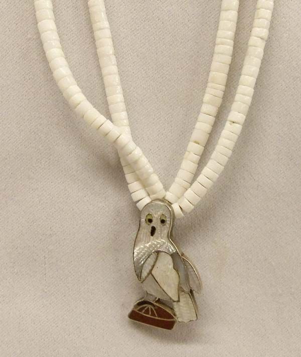 Native American Zuni Snow Owl Pendant Necklace. The pendant is channel set inlays of mother-of-pearl with jet accents, signed by ''Pablita Quam''. The white heishi two strand necklace measures 24''. The pendant/pin is 1 1/2'' x 1''. This is a sweet piece of Native American craftsmanship.
