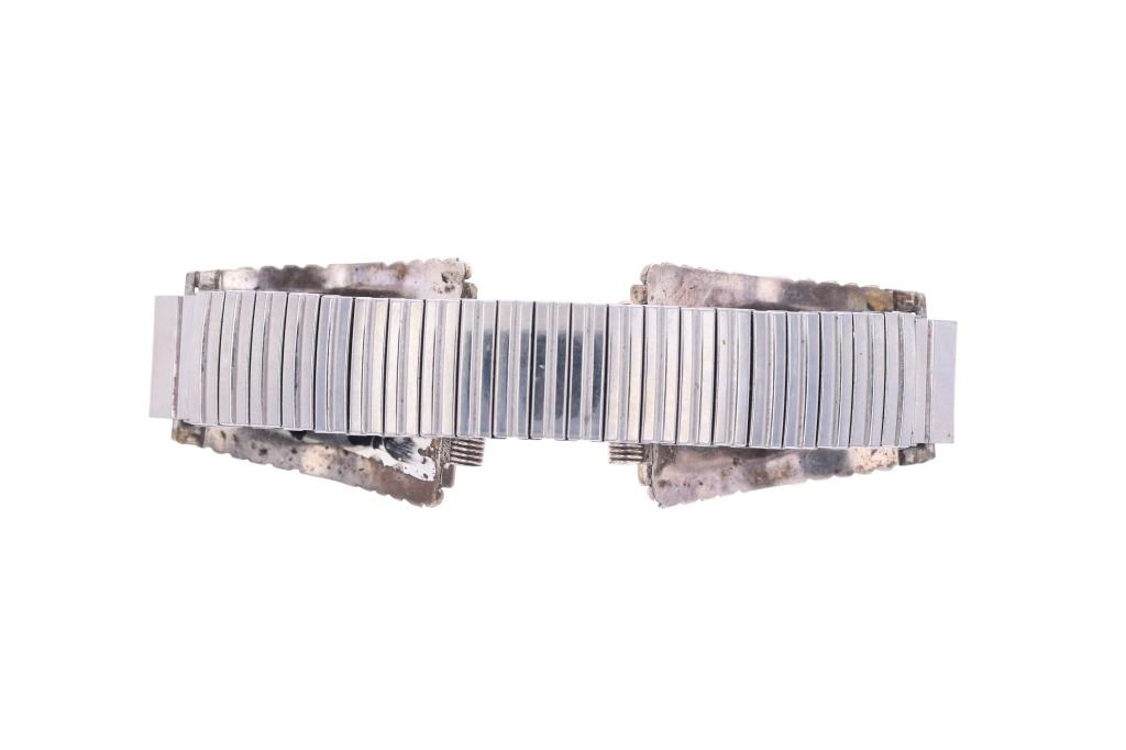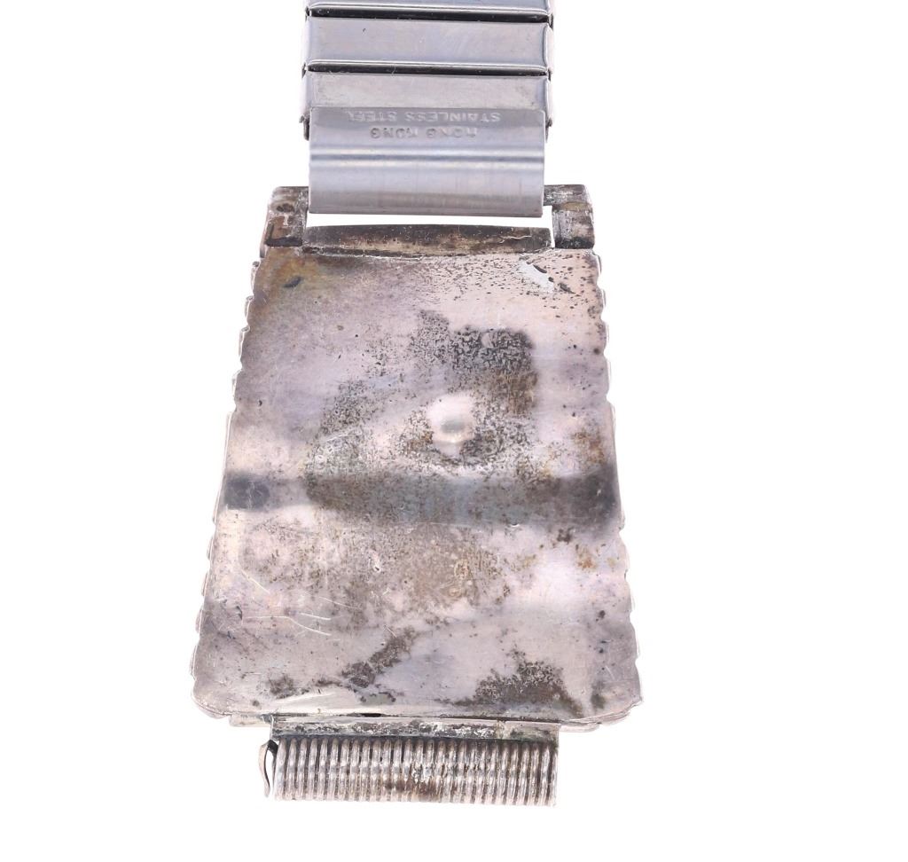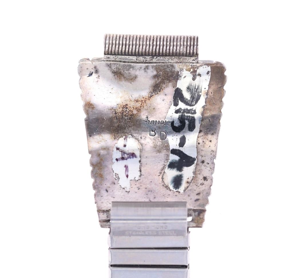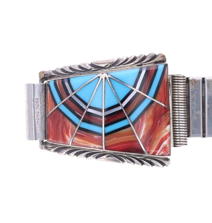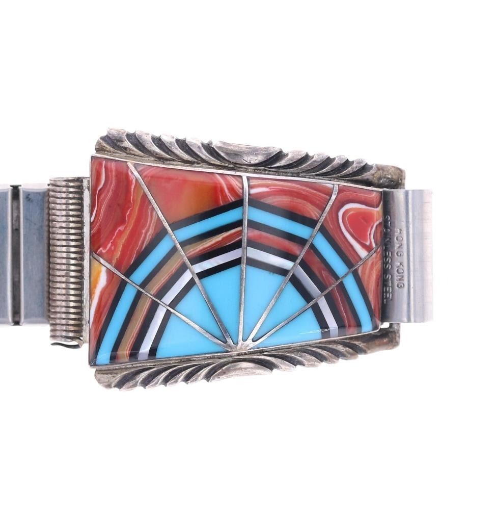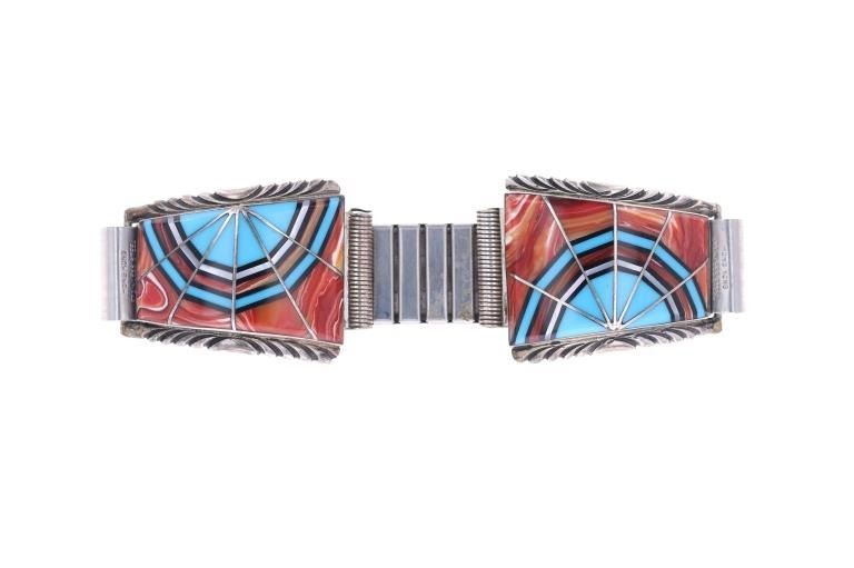 This is a late vintage watch cuff signed BD from a Zuni artist with a fantastic Spiderweb multiple stone inlaid deisgn. The cuff tips are in sterling silver, marked as such BD STERLING, with a unique design in a radiating spiderweb design. The stones include agate, turquoise, black stone, mother of pearl. The set is well kept and is on a stretchy watch band. Each cuff is about 1.5" by 1 1/8"L. Total length of 6 5/8"L. Total weight of 36.3 grams.