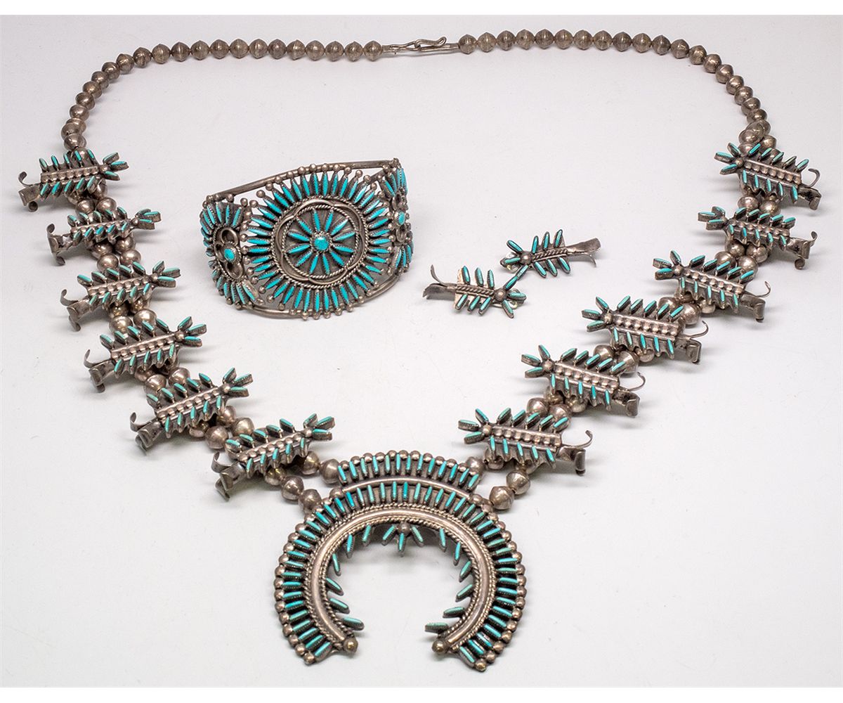c1970 This lot features a superb set of needlepoint turquoise Zuni jewelry. The necklace, when laid flat measures about 17” long. A marker’s mark on the obverse credits J.S. Bellson as the designer. The “J” and “S” stand for James and Shirley Bellson, two Zuni artists who were active from the 1970s to the 1980s. This necklace was featured the January 1974 issue of Arizona Highways. Also included in the lot is a set of matching earrings that each measure about 1.25” long. Lastly there is a matching bracelet measures about 3” across and 2” tall. These items were purchased in 1974 from Bing Crosby’s in Albuquerque. - HKA#66114