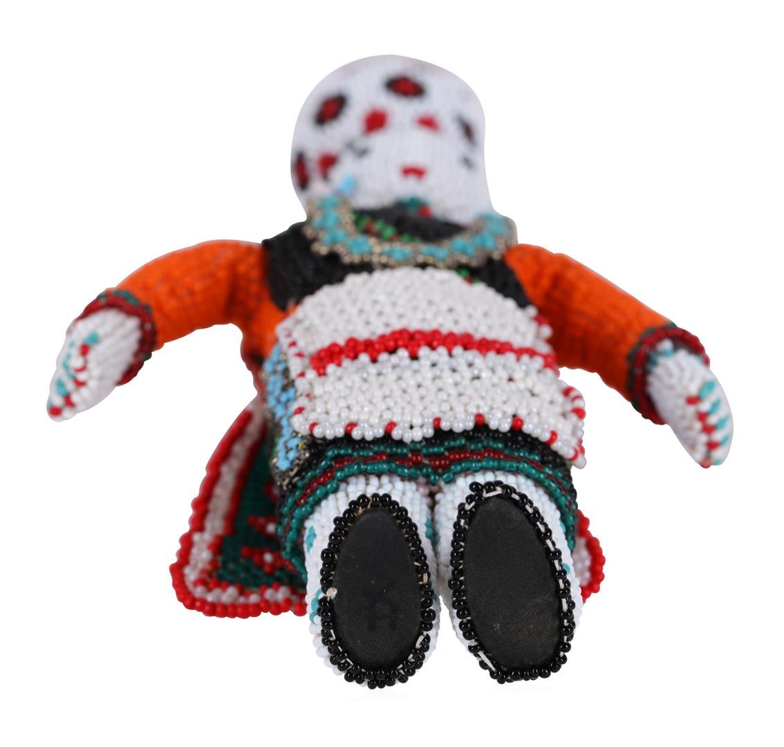 Amazingly intricately beaded Zuni doll. She is wearing a squash blossom necklace and concho belt, a tunic, and overlay skirt. All done in finely woven beads. Height is 6" tall. This doll was done by a very talented Zuni beader and there were hours put into this beautiful doll.