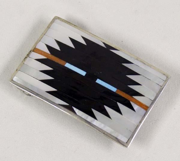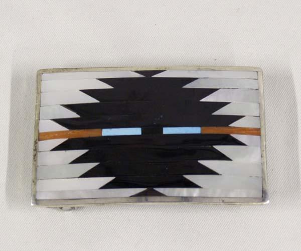Zuni Sterling Belt Buckle inlay with Mother Of Pearl, Turquoise and Coral. Signed C. Dishta, measures approx. 2'' x 3''. SHI $20.
