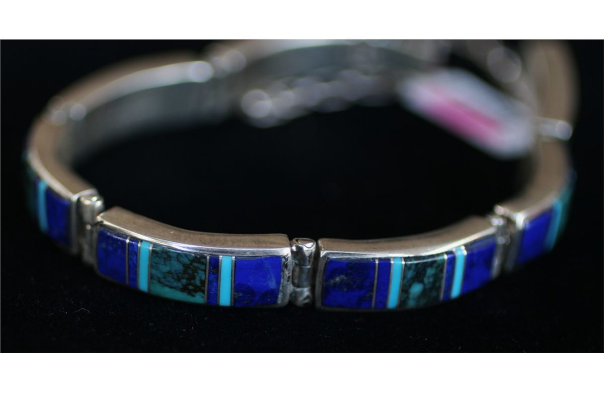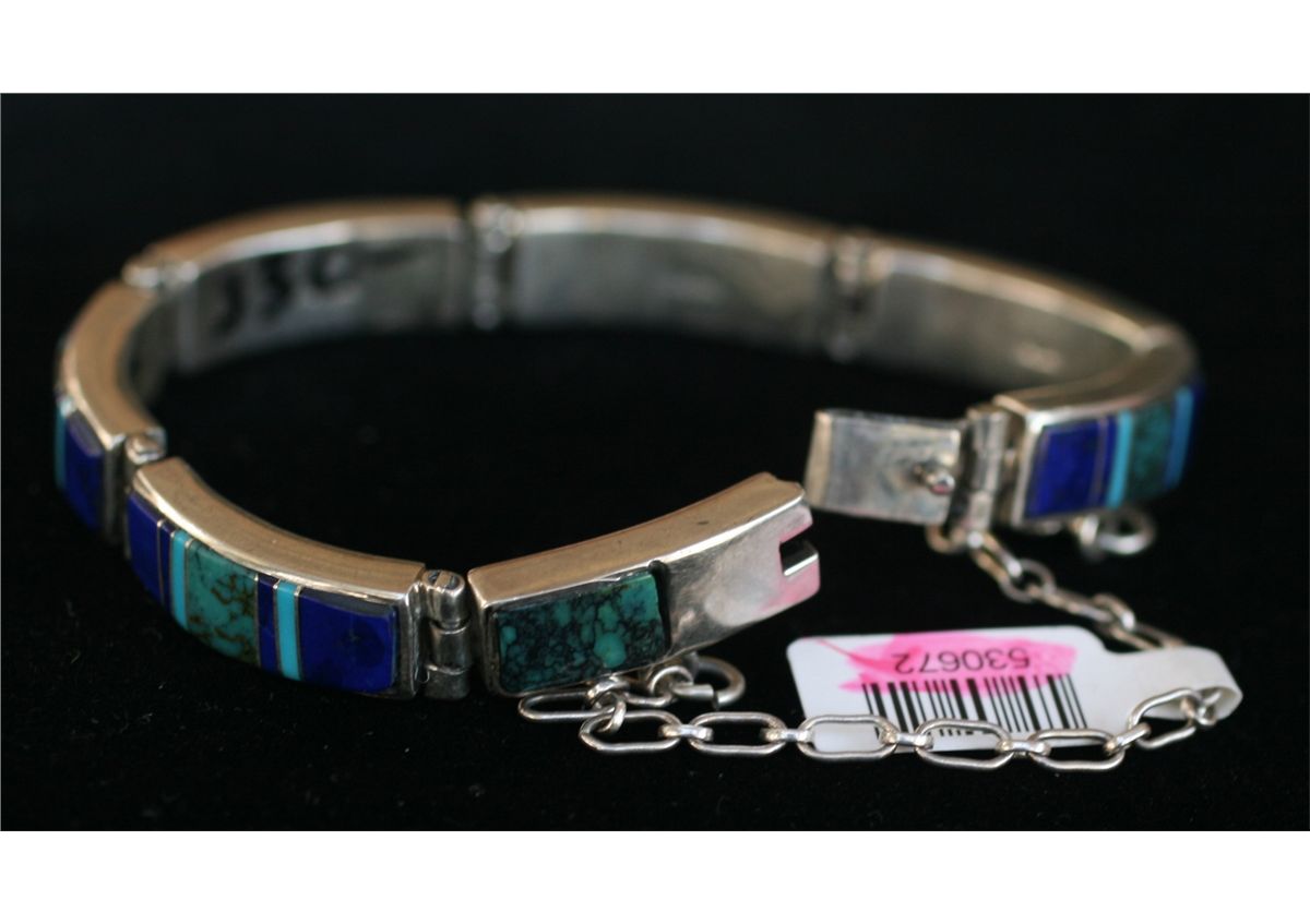 Sterling silver link bracelet with turquois, silver and lapis lazuli inlay signed DJ, 530672 B975