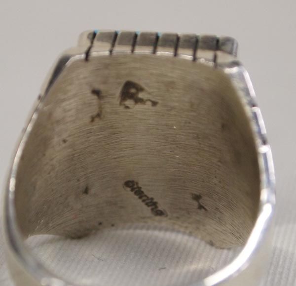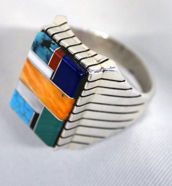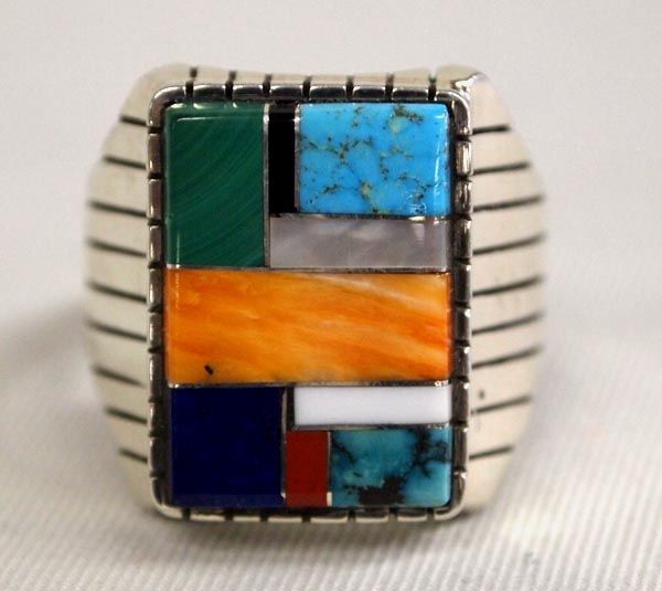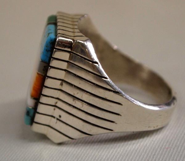 Native American Zuni Sterling Silver Channel Inlay Ring Size 12. Hallmark ''R''. Ring has Red Shell, Turquoise, Jet, Mother of Pearl and Coral. Inlay on the ring face measures approx. 3/4'' x 1/2''. Gorgeous inlay on this ring.