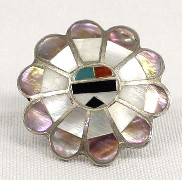 Native American Zuni Sterling Channel Inlay Sunface Ring, Size 6.5, inlay includes mother of pearl, coral, turquoise, abalone, and onyx (or jet), measures 1''D
