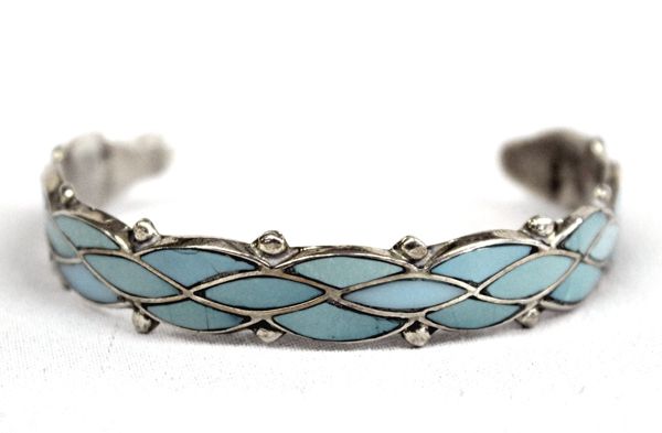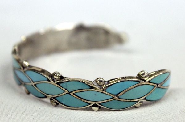 Zuni Sterling Channel Inlay Turquoise Bracelet, inside measures 6'' which includes opening by 7/16''W, silver accent beads on border, 10.29g in total wt.