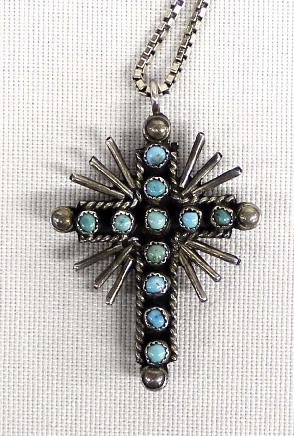 Estate Native American Zuni Sterling Double Sided Coral/Turquoise Cross Pendant Necklace, cross pendant measures 1.5'', sterling chain measures 19''L end to end, coral on one side and turquoise on the other, beautiful piece