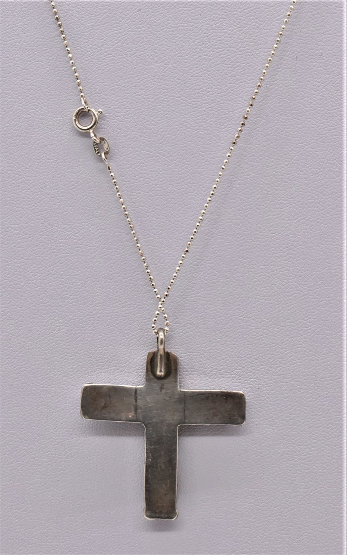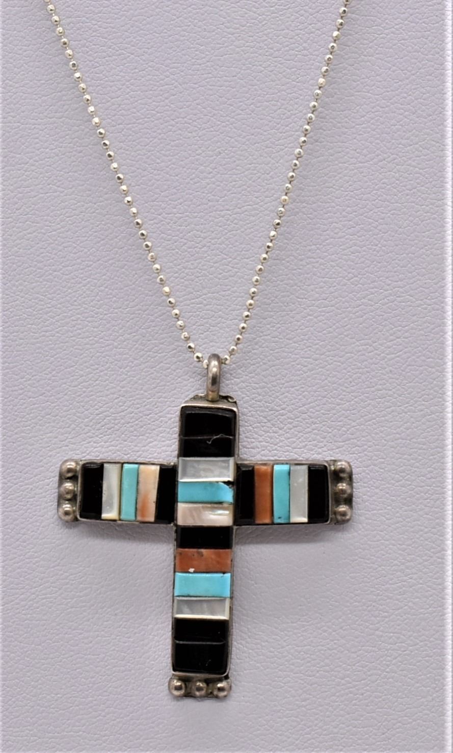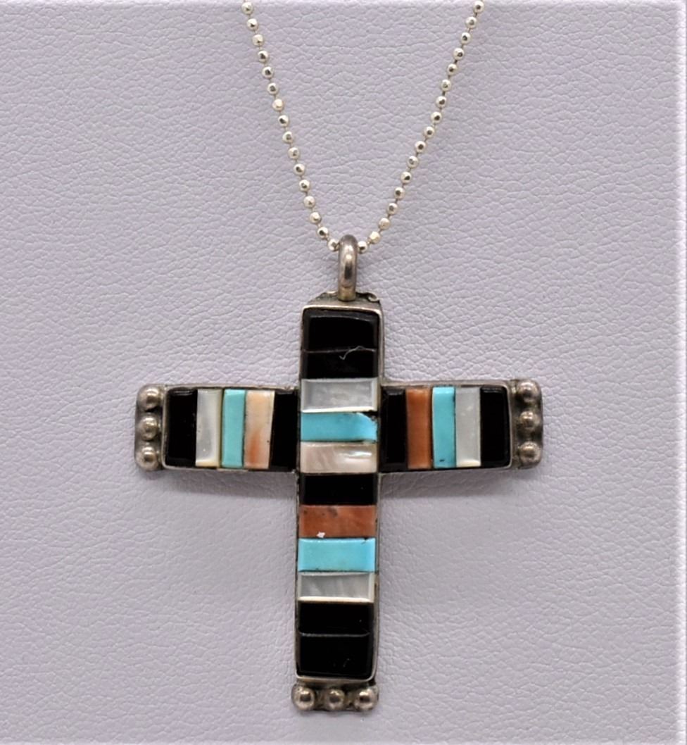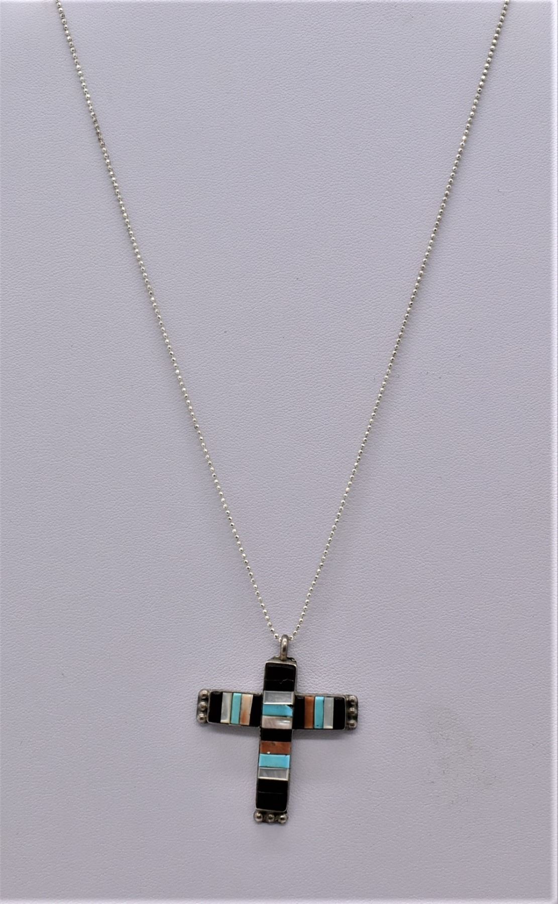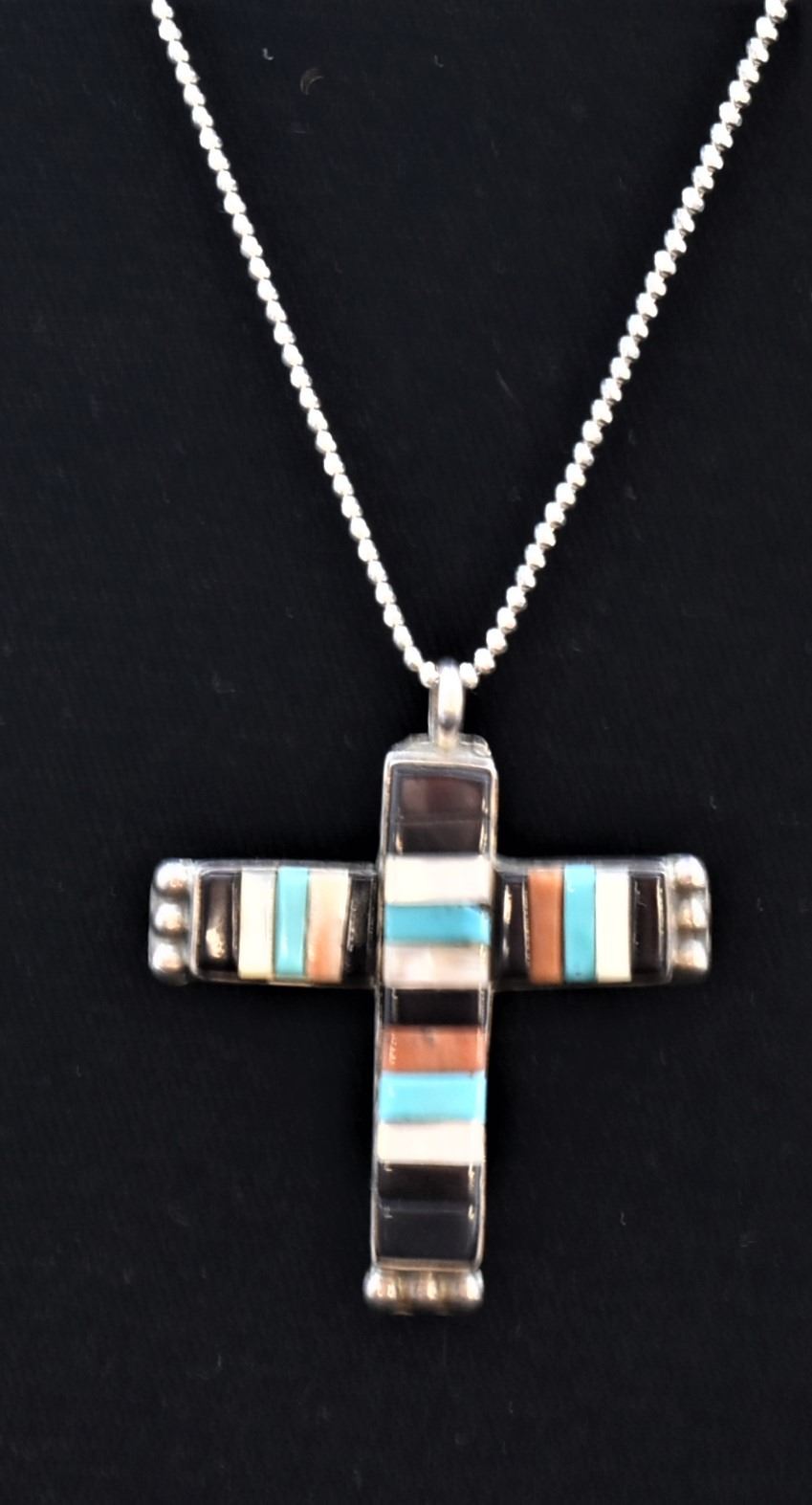 Native American Zuni Sterling Inlay Cross Pendant Necklace by Clifford Cheama, pendant measures 2'' x 1.5'', inlay includes turquoise, onyx, red shell, and mother of pearl, Italian sterling chain measures 18''L end to end and is marked, engraved initials CC on back, 7.61 grams total wt.
