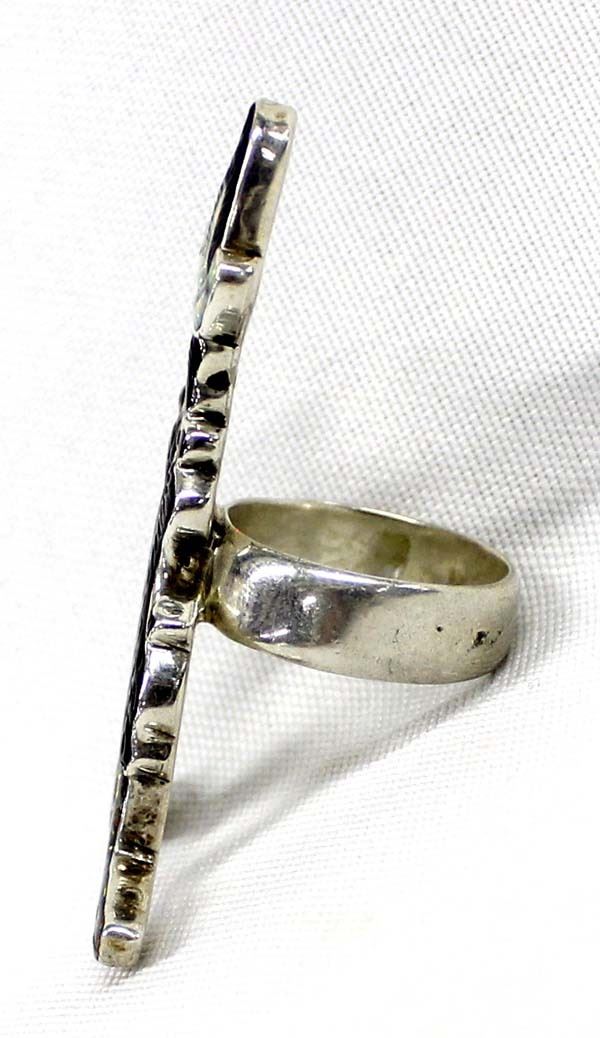 Native American Zuni Sterling Inlay Daffy Duck Ring, Size 6.5, measures 2''L x 1''W, opal, fire opal, and jet, stamped sterling