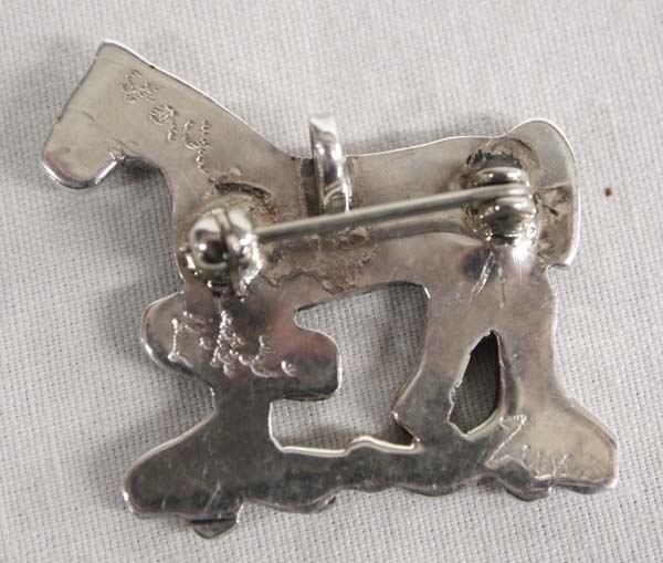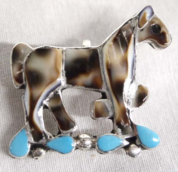 Sweet Native American Zuni Sterling Silver Turquoise and Shell Inlay Horse Pin Pendant by Ed Leekity, measures 1'' x 1'', engraved initials EAL, 4.73g in total wt.