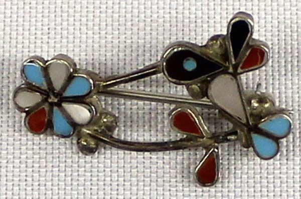 Native American Zuni Sterling Inlay Hummingbird and Flower Pin, measures .5'' x 1'', inlay includes turquoise, mother of pearl, jet, and coral