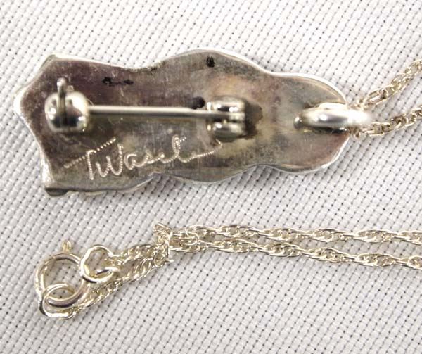 Native American Zuni Sterling Inlay Maiden Pin Pendant by Teresa Waseta, engraved signature, pendant measures 1''L x .5''W, sterling chain measures 18'' end to end