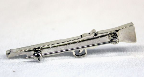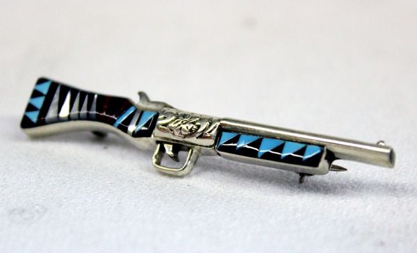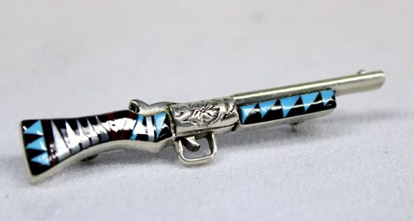 Zuni Sterling Inlay Rifle Pin by E. Lukela, features gorgeous stone to stone inlay of turquoise, jet, abalone, and coral, signed on back and measures 2in L x .25in W, what a unique little piece