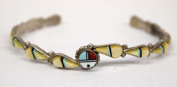 Native American Zuni Sterling Silver Channel Inlay Sun God Bracelet by H/C Dickson, inside measures 6'' which includes opening x 3/8''W, inlay consists of gold lip shell, mother of pearl, turquoise, jet, and coral, hallmarked