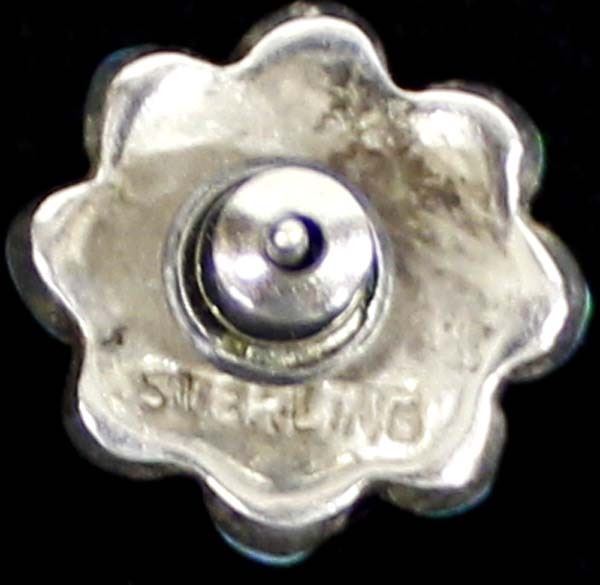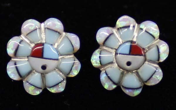 Native American Zuni Inlay Sun God Earrings, measure .5''D, inlay includes turquoise, opal, coral, jet, and mother of pearl, stamped sterling