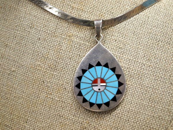 Zuni Sterling Inlay Sun God Necklace- F.L. Natachu hallmarked and stamped sterling. Measures 25'' end to end. Pendant measures 2''L including bail.