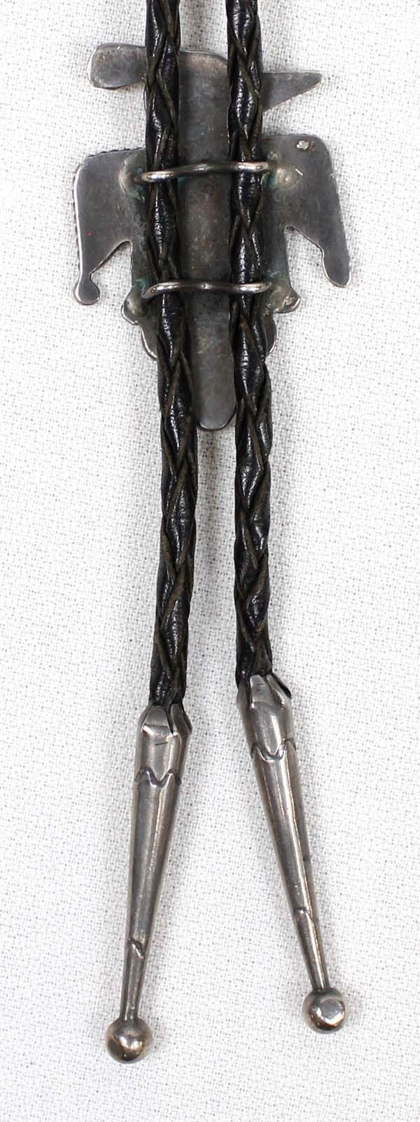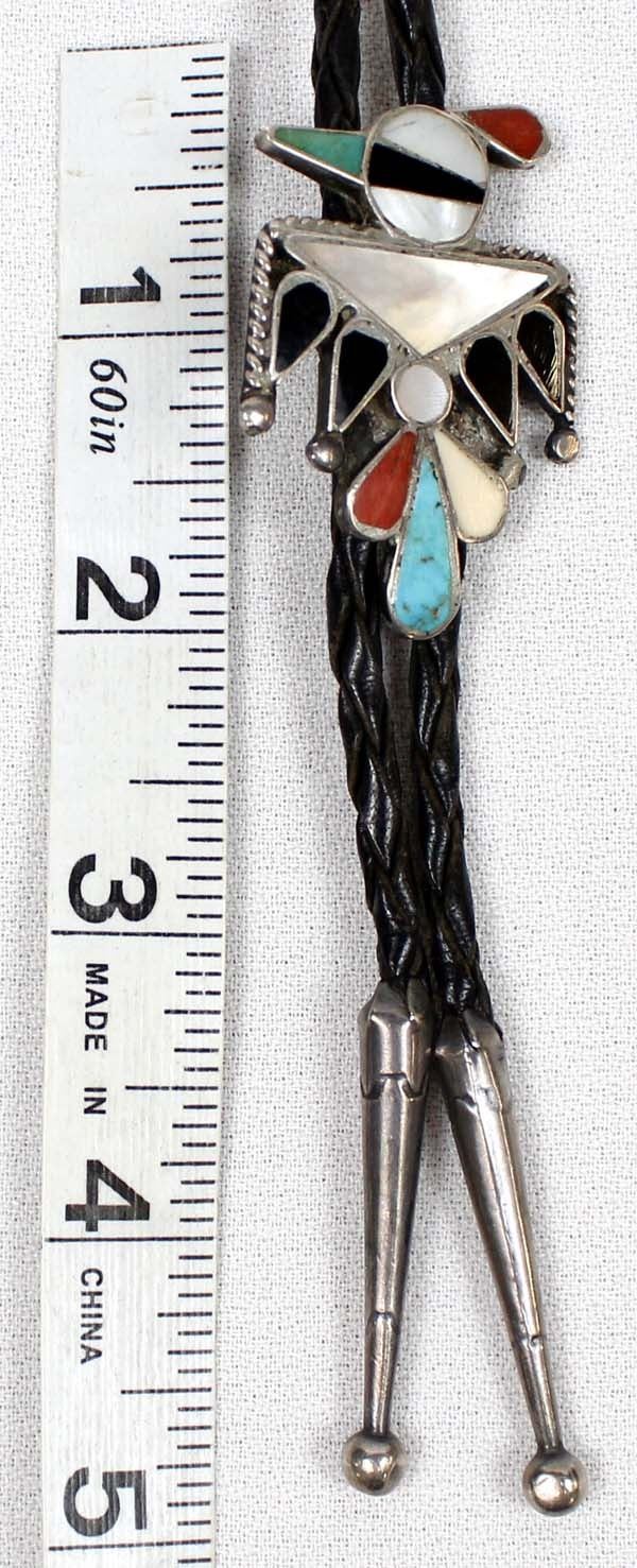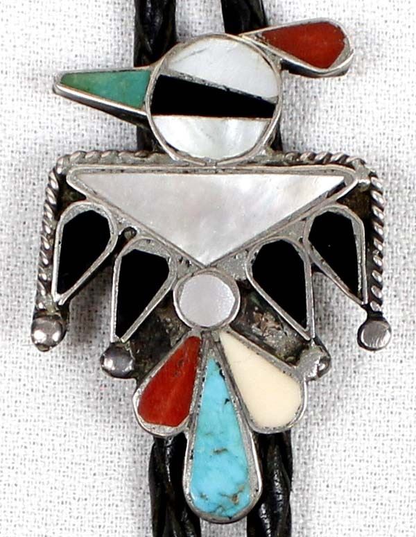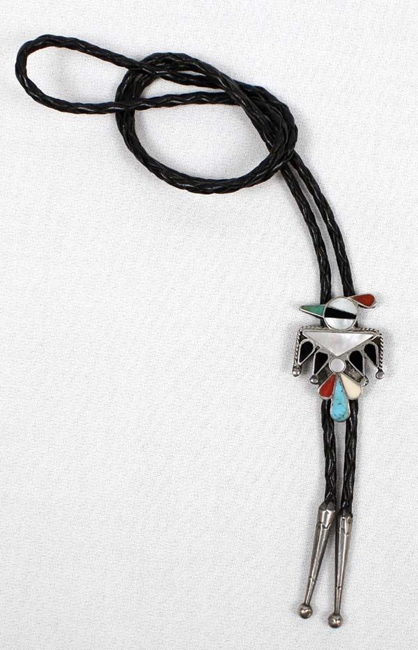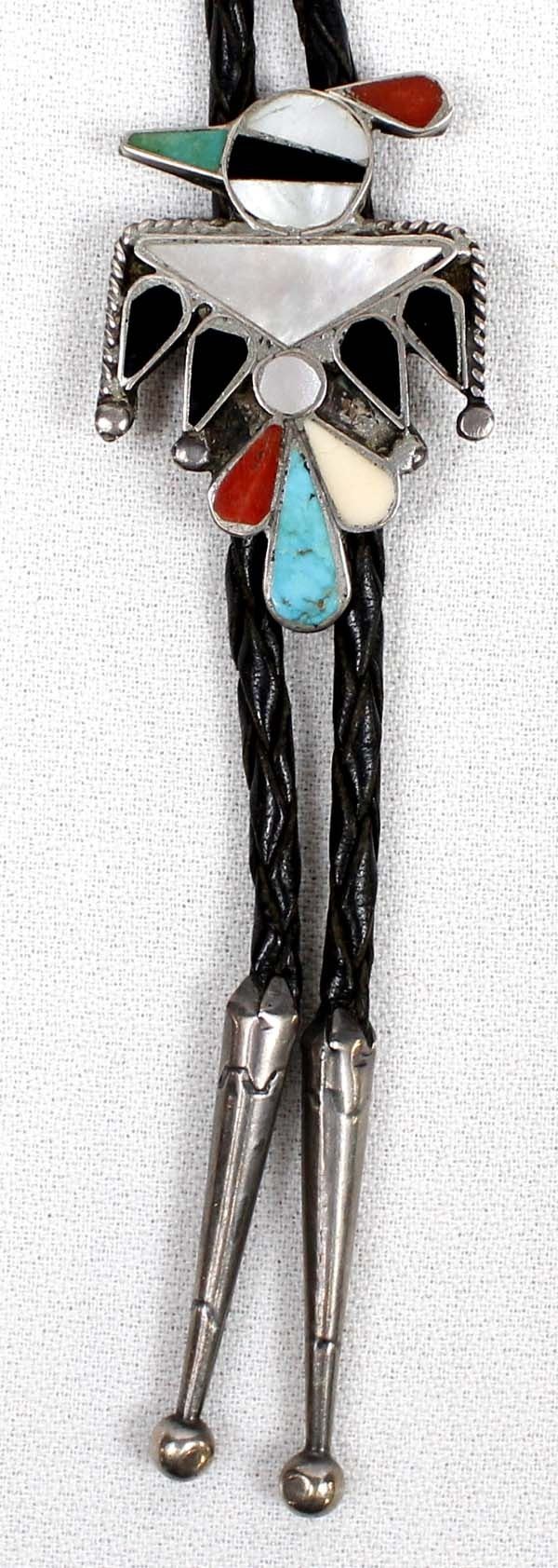 Historic Native American Zuni Sterling Inlay Thunderbird Bolo Tie, slide measures 1.25'' x 1.75'', braided leather tie, sterling aglets, inlay includes onyx, mother of pearl, turquoise, and coral